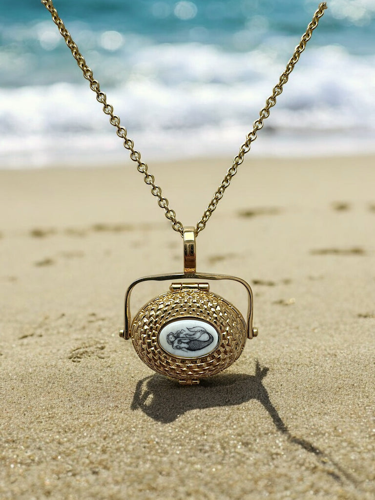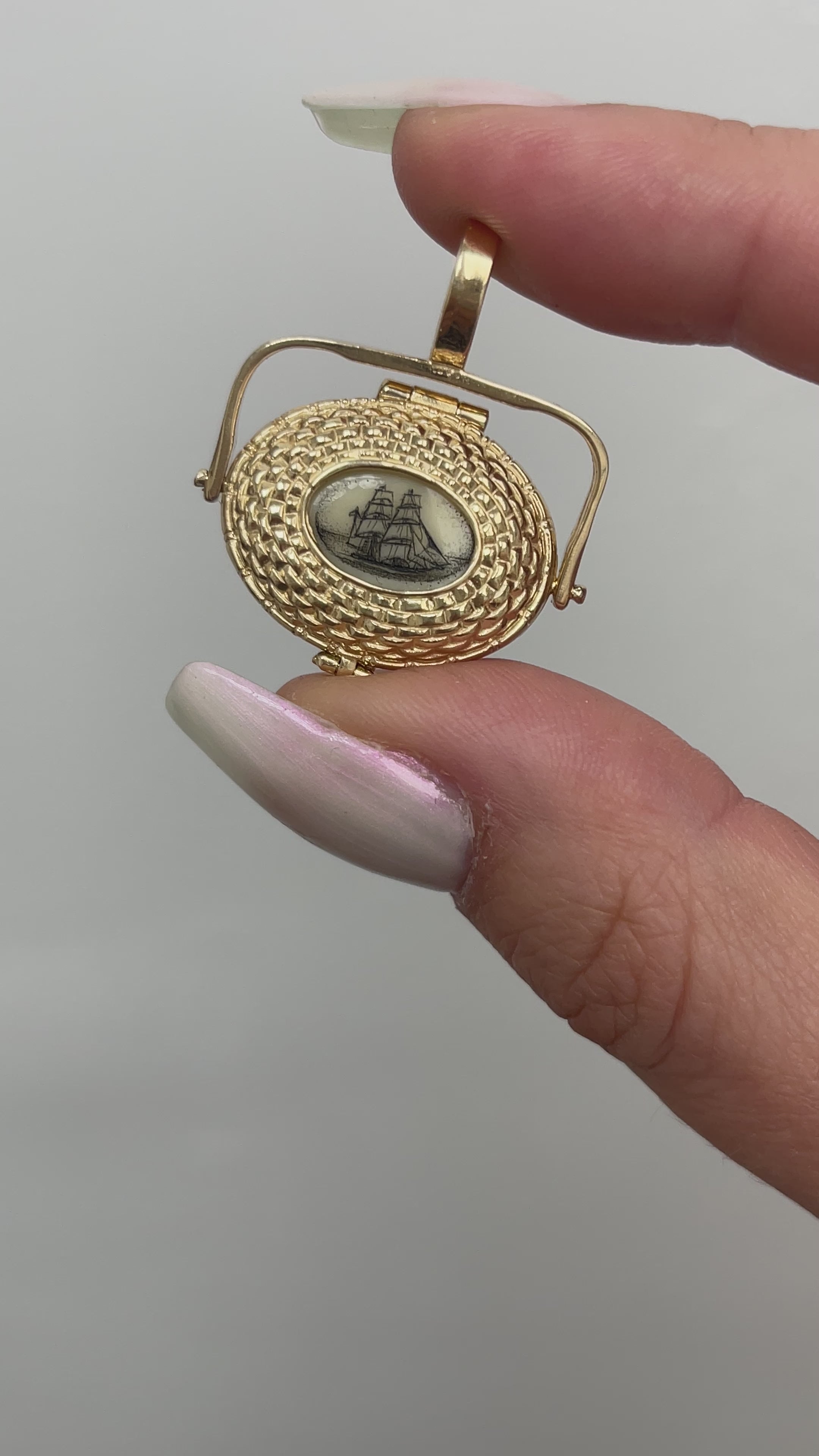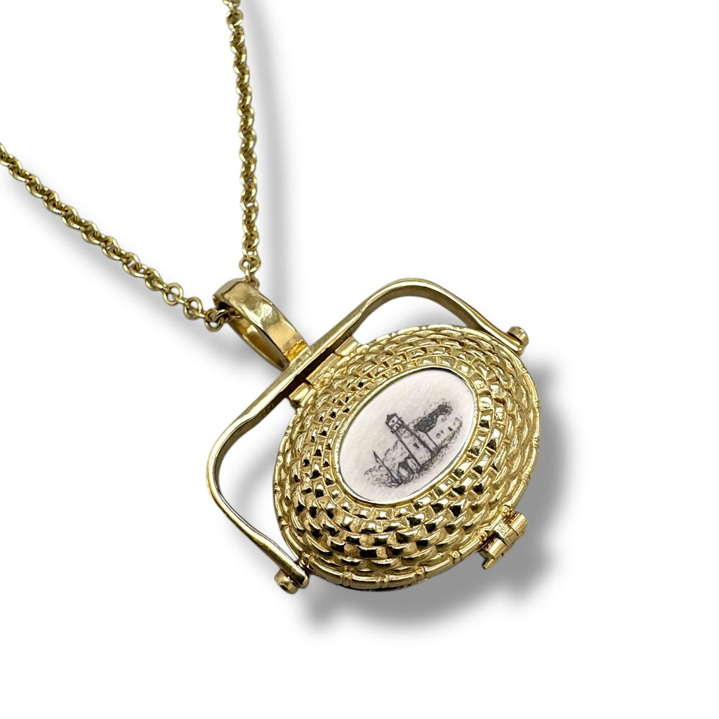 An homage to the traditional Nantucket lightship baskets, our signature 14k gold locket version features stunningly detailed woven texture as well as a genuine scrimshaw inlay. The hinged handle bail is large enough to accommodate an omega style necklace, a thicker chain, or a cord. Open the locket to reveal the perfect place for a tiny trinket or photograph! Chains sold separately.