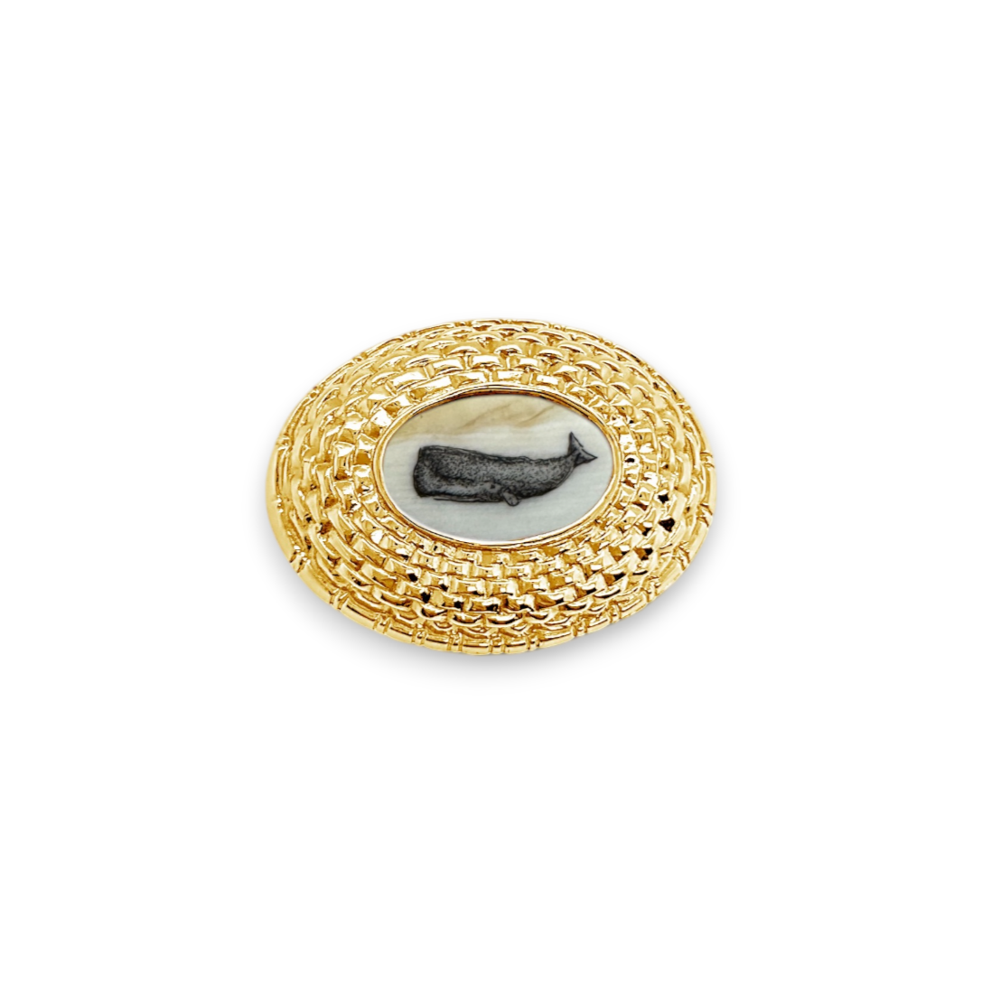 In the style of the Nantucket lightship baskets, this slide is a 14k yellow gold rendering of a woven basket top featuring a genuine scrimshaw inlay. Slides are best worn on an omega style necklace, heavy chain, or cord. A solid 7mm wide cross-bar secures the slide on the reverse.