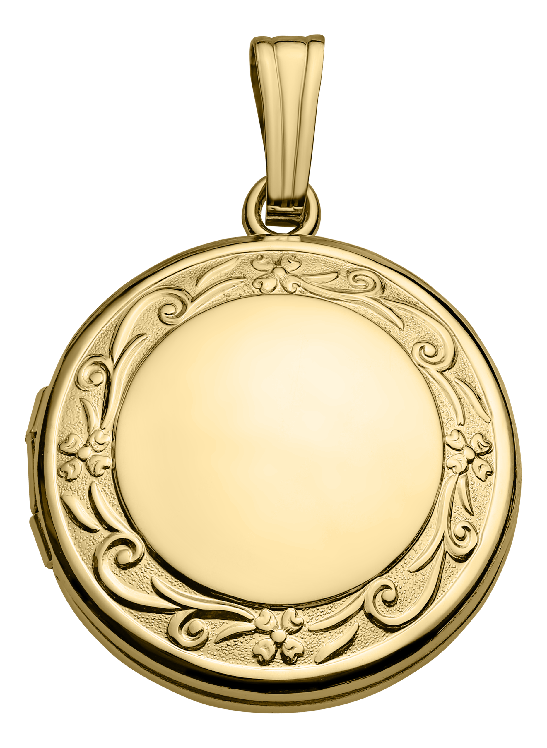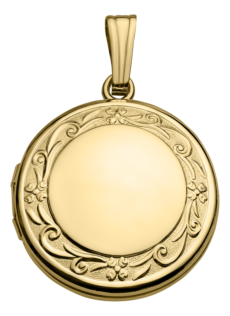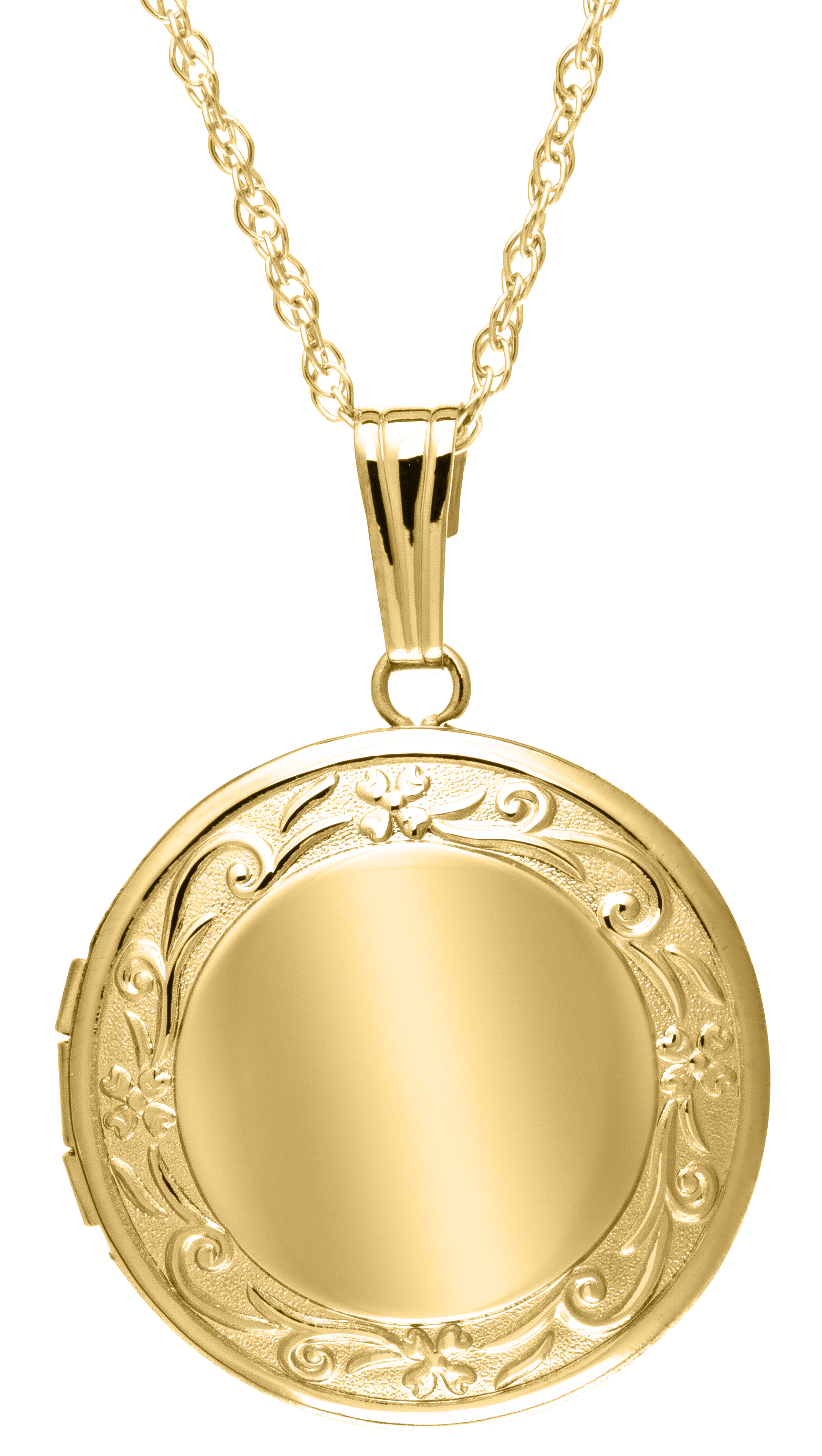 Embrace timeless elegance with this exquisite 14k yellow gold round locket. Measuring 19MM in diameter, the locket features a beautifully embossed floral border that adds a touch of romantic charm. Complete with an 18" fine rope chain, this precious keepsake allows you to carry cherished memories close to your heart wherever you go.