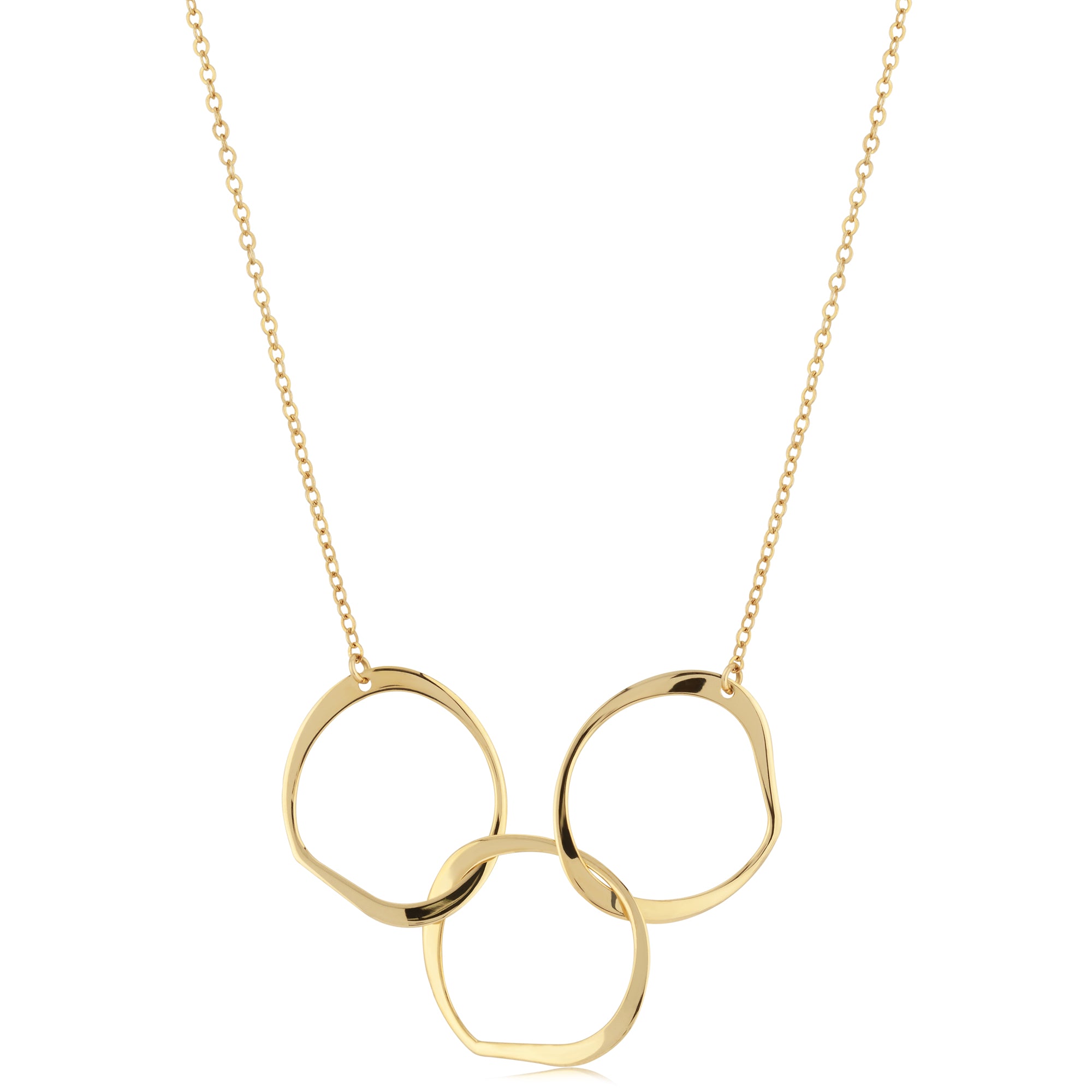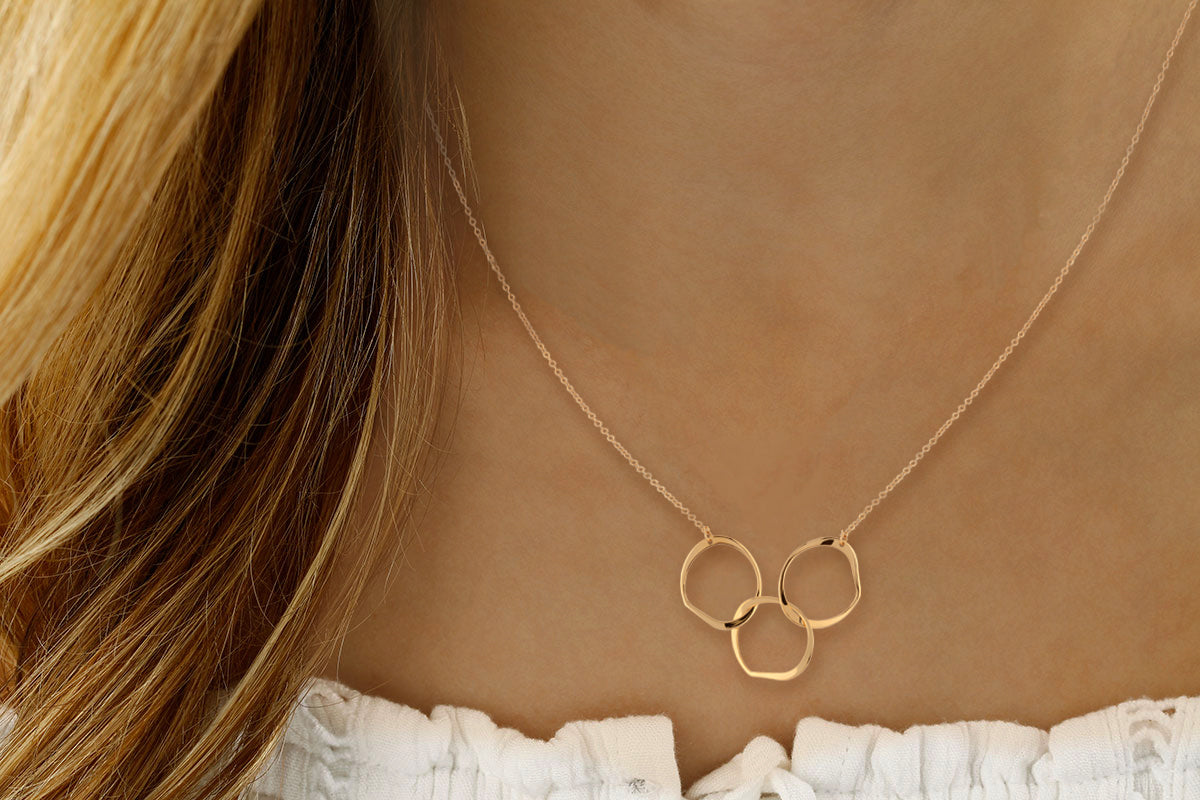 Crafted in 14k yellow gold, this Interlocking Circles Necklace features elegant freeform circles linked together, symbolizing connection and unity. The fine cable chain is adjustable from 16 to 18 inches, allowing you to customize the fit for comfort and style. This delicate piece adds a meaningful touch to any outfit while offering versatility for daily wear or special occasions.