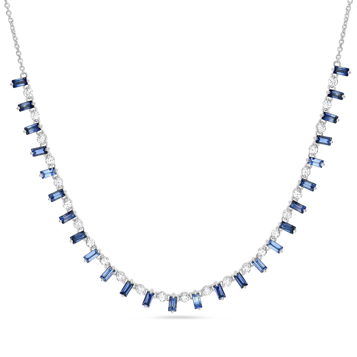 This stunning necklace showcases the perfect balance of elegance and playfulness. Crafted in 14k white gold, it features 3.90 carats of vibrant blue sapphire baguettes that alternate beautifully with 1.06 carats of sparkling round diamonds in a charming fringe design. The delicate cable chain adjusts from 16 to 18 inches, offering versatile styling for any occasion. A timeless piece that celebrates your unique sense of style.