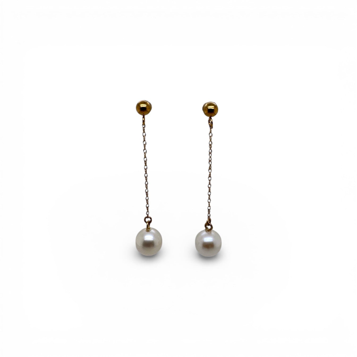Elegant 14k yellow gold earrings featuring lustrous 8mm white freshwater pearls gracefully suspended from delicate cable chain. Each pearl hangs freely, creating gentle movement with every wear. Finished with bead earring tops, classic posts & friction backs.