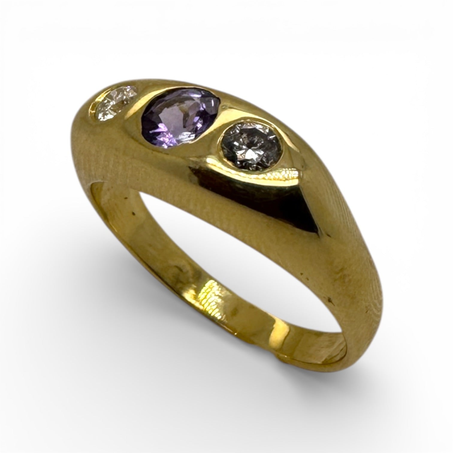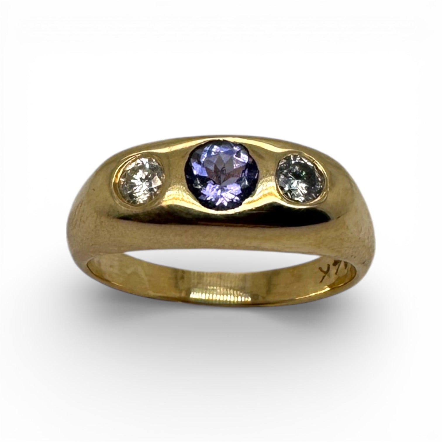 Crafted in 14k yellow gold, this ring features a 0.30 carat Tanzanite set flush with complementary natural round diamonds totaling 0.17 ctw. The low-profile flush setting provides secure retention while maintaining a sleek silhouette ideal for stacking or wearing independently. The substantial gold construction ensures lasting durability and a substantial feel on the hand. Whether positioned as a signature pinky ring or layered within a collection, this piece balances refined aesthetics with practical everyday wearability.