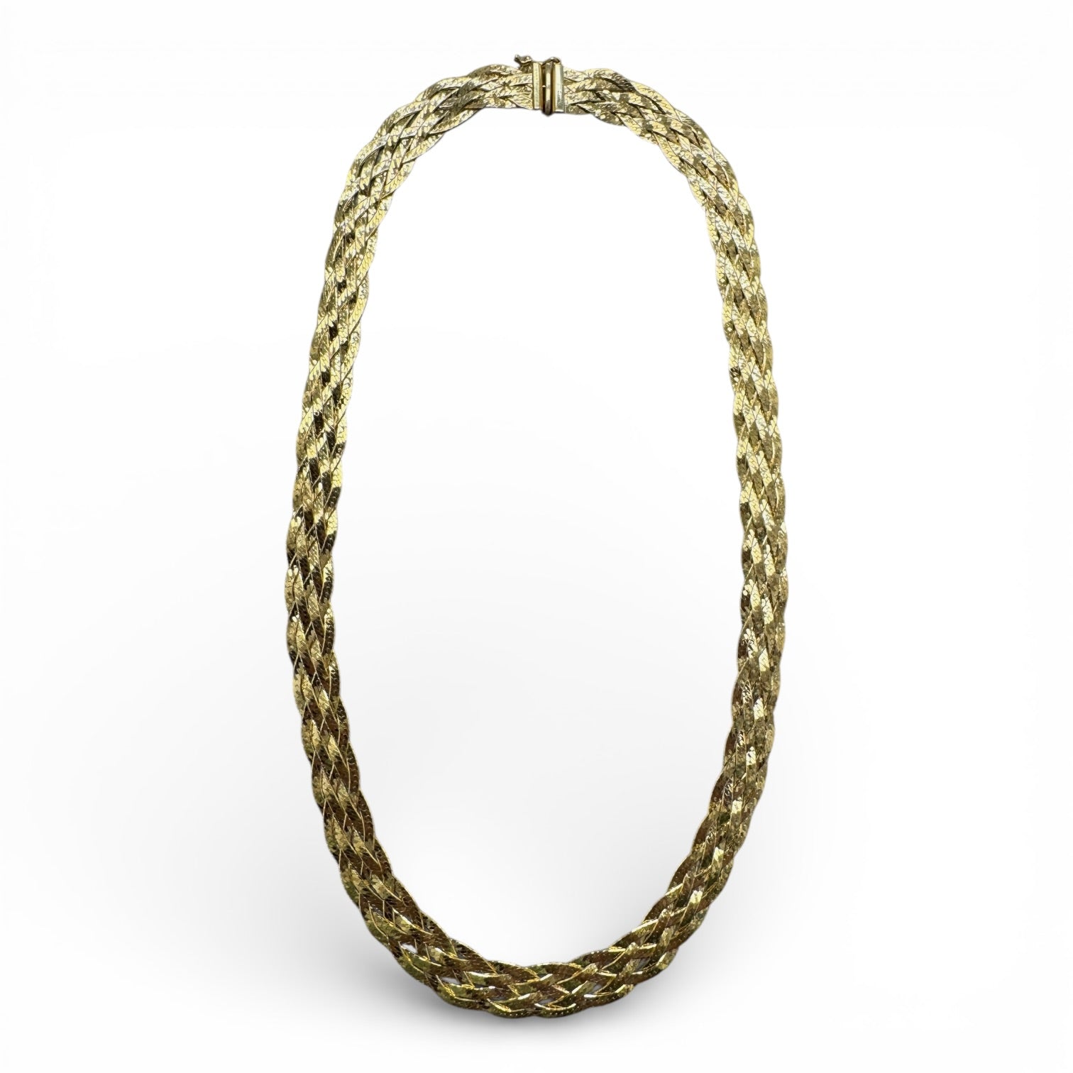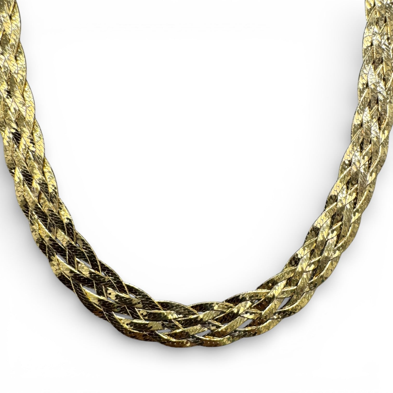 This beautifully maintained estate piece showcases four-strand braided herringbone chains in 14k yellow gold, crafted with the precision and durability that defines fine jewelry. The substantial 9mm width creates an elegant presence while remaining versatile enough for layering or solo wear. A discreet box clasp ensures secure fastening, and the 16" length sits gracefully at the collarbone. A timeless investment piece that bridges vintage craftsmanship with contemporary style.