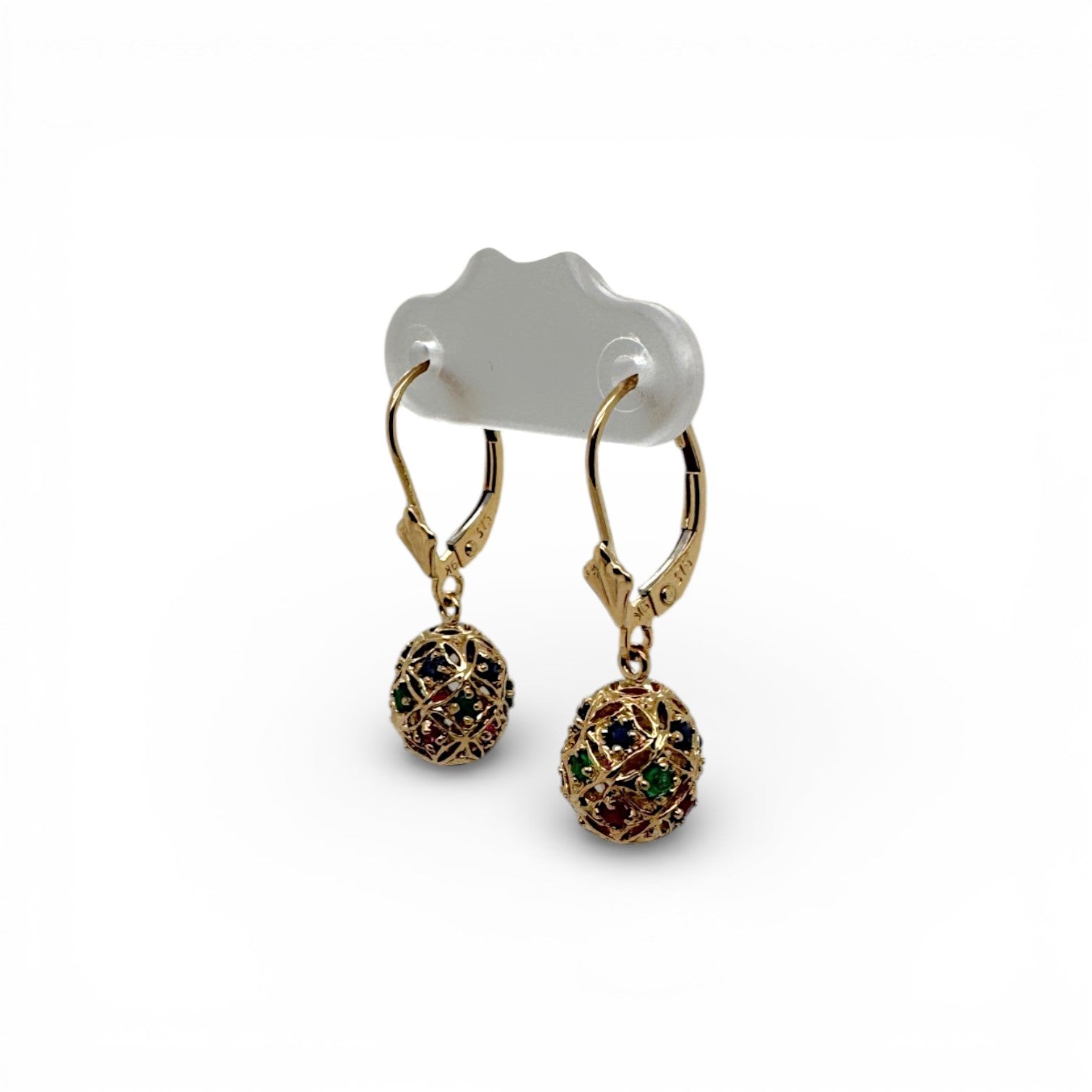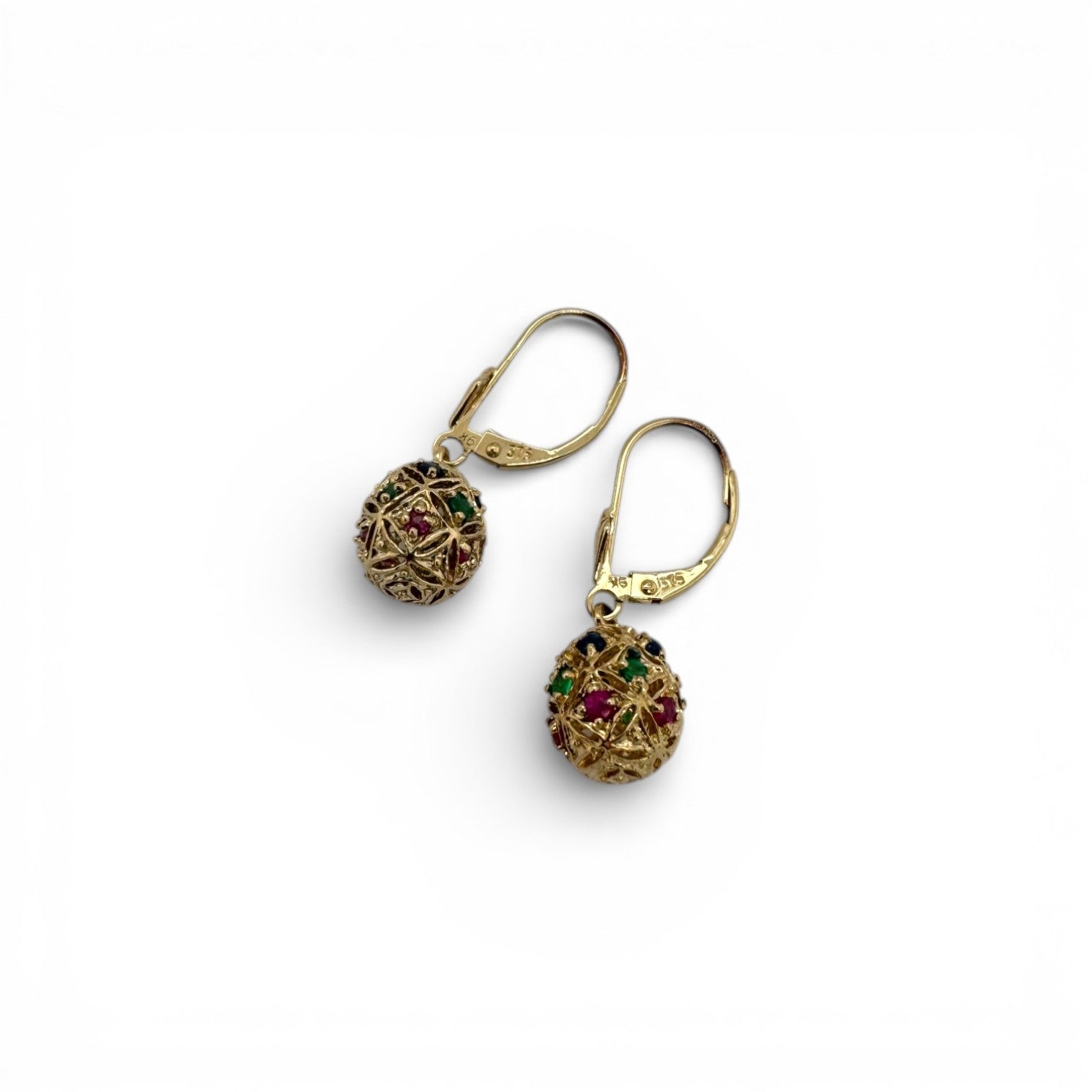 Discover timeless elegance with these European-crafted estate earrings, featuring delicate 9k yellow gold pierced ball designs adorned with vibrant rubies, sapphires, and emeralds. The intricate gemstone setting showcases classic craftsmanship, while convenient leverback closures ensure secure, comfortable all-day wear. A sophisticated vintage piece that brings color and refinement to any collection.