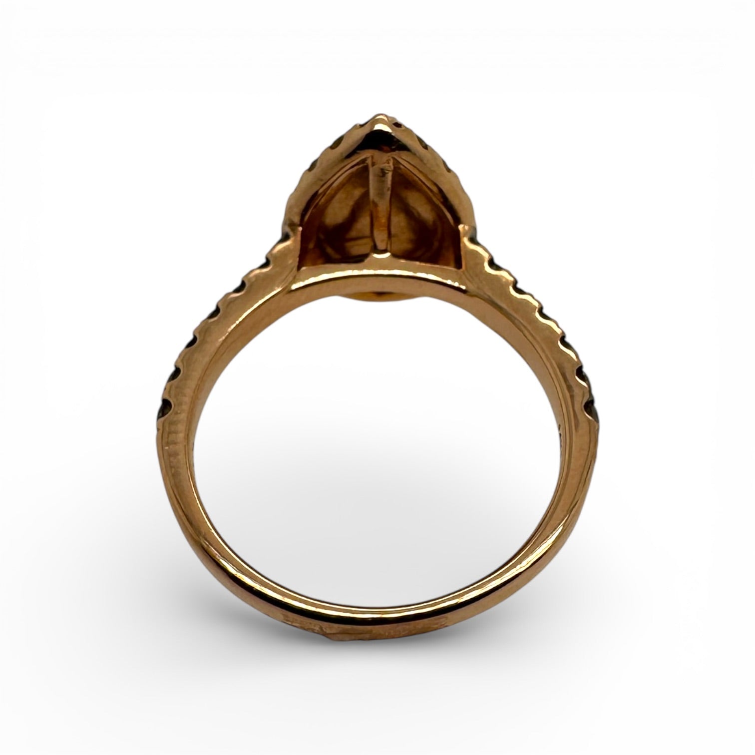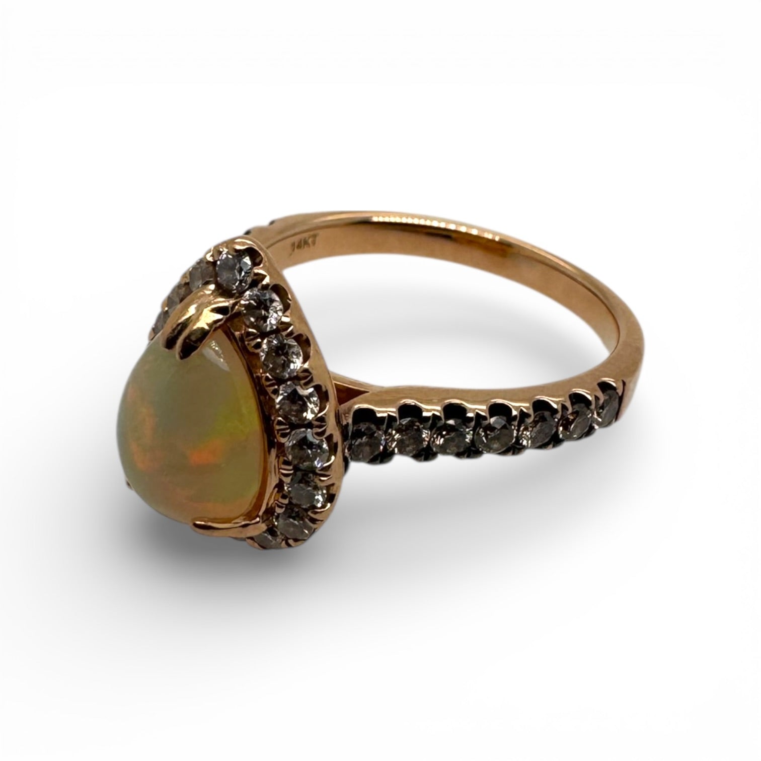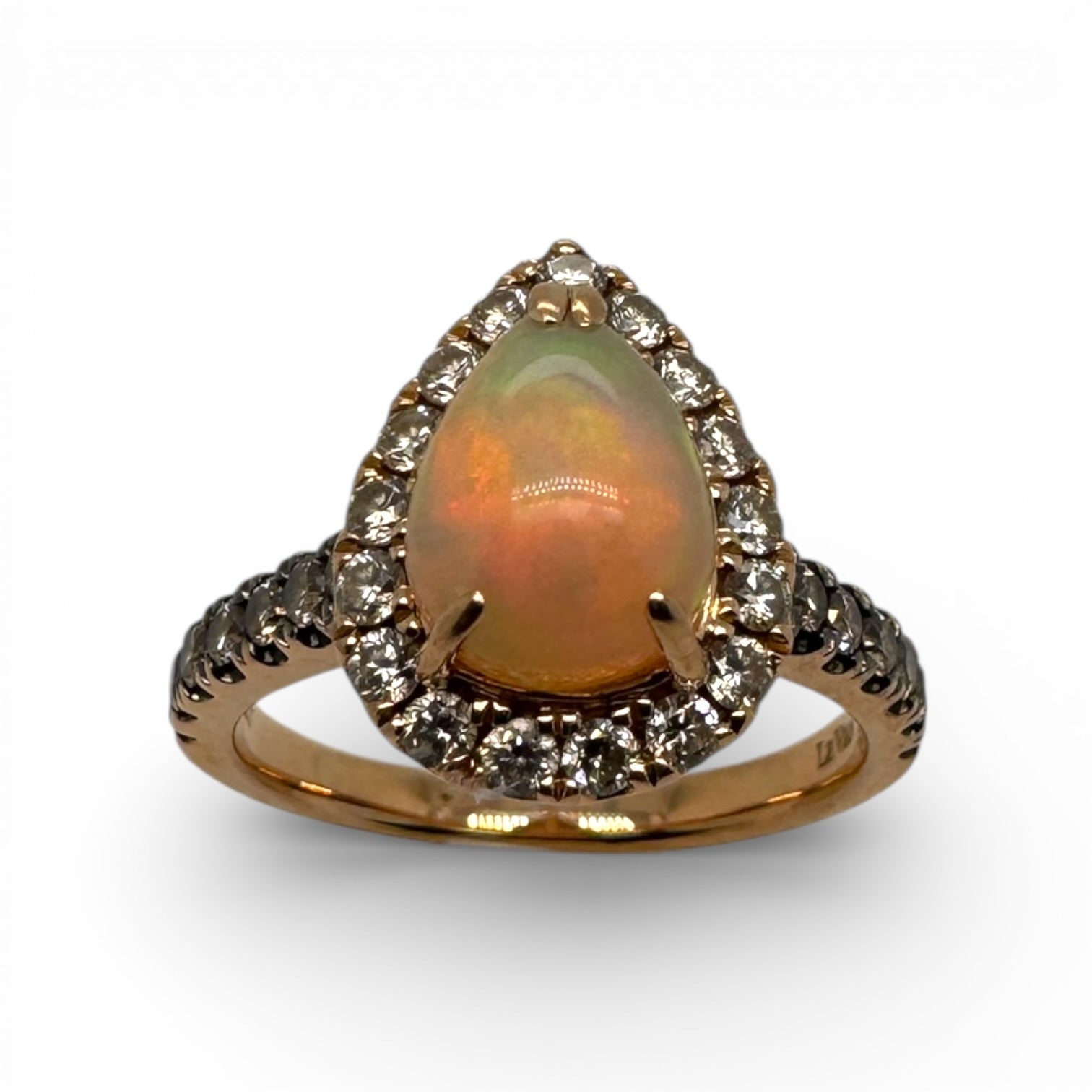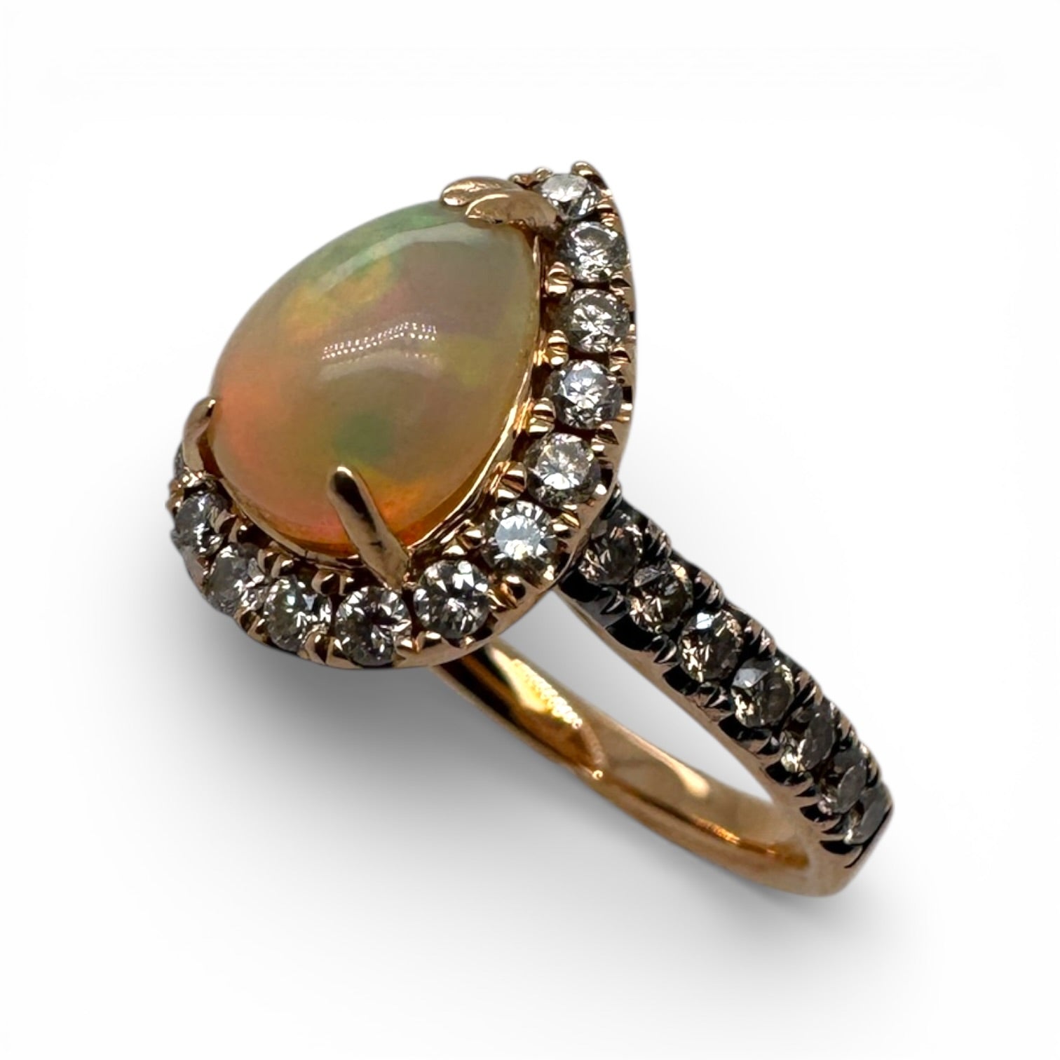 Discover the magic of this exquisite estate ring, where a radiant 1.66-carat pear-shaped jelly opal takes center stage, surrounded by a glittering halo of natural round diamonds that enhance its mesmerizing rainbow play-of-color. The 14K rose gold band features French-set diamonds flowing gracefully down each side, while a sleek black rhodium finish provides striking contrast and modern sophistication. Sized at 7 with 0.74 CTW of diamonds, this piece combines vintage elegance with contemporary flairâan ideal choice for those who appreciate unique, statement-making jewelry.