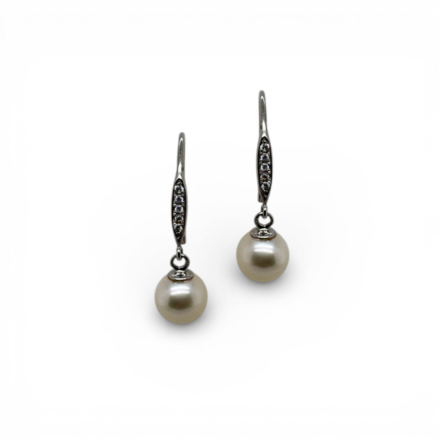 Elegant white cultured pearl drop earrings featuring delicate 6.5mm dangles suspended from 14k white gold French wire tops. Each earring is adorned with bead-set natural diamonds that catch the light beautifully. The timeless design transitions effortlessly from casual to formal occasions, making these versatile pearls a wardrobe essential.Â