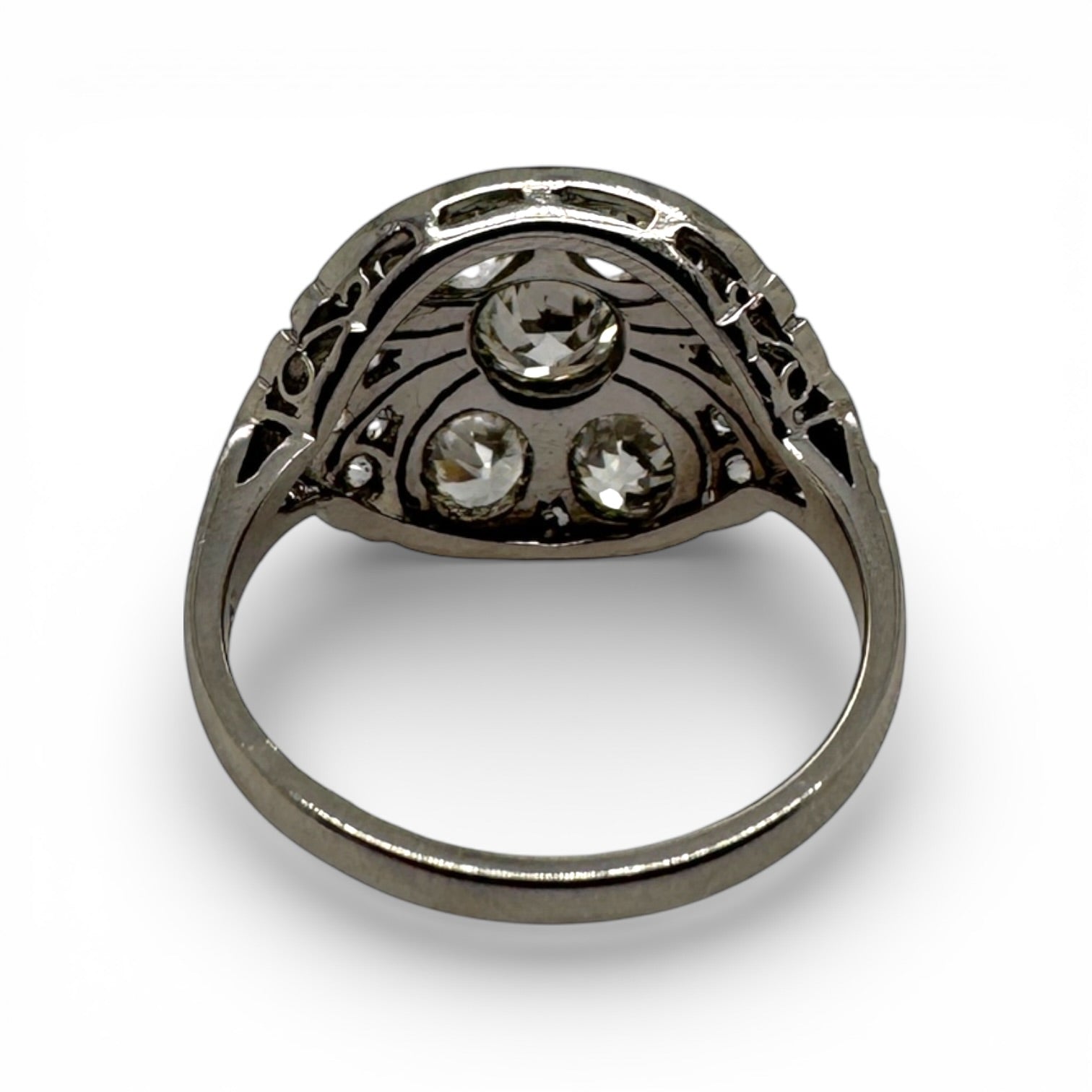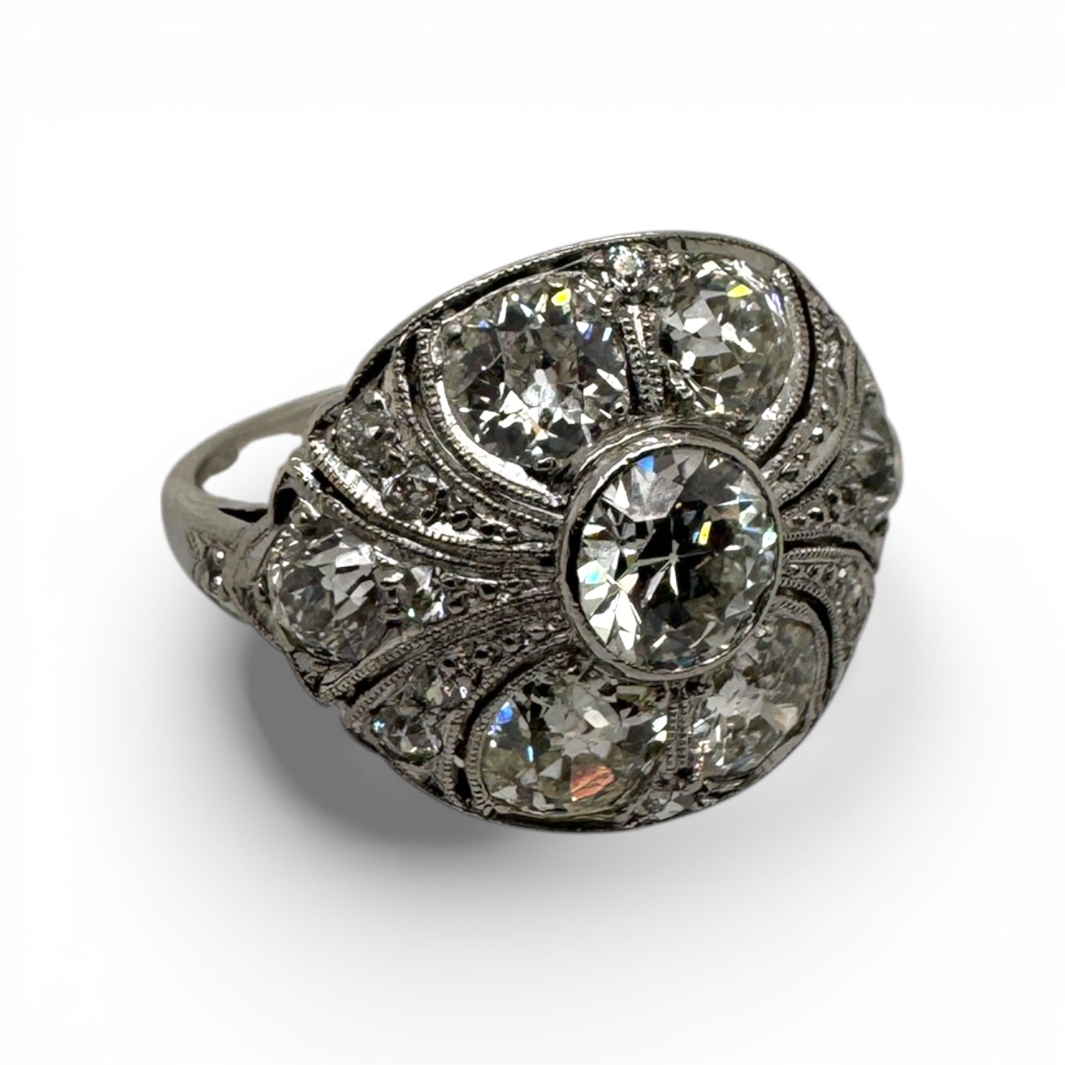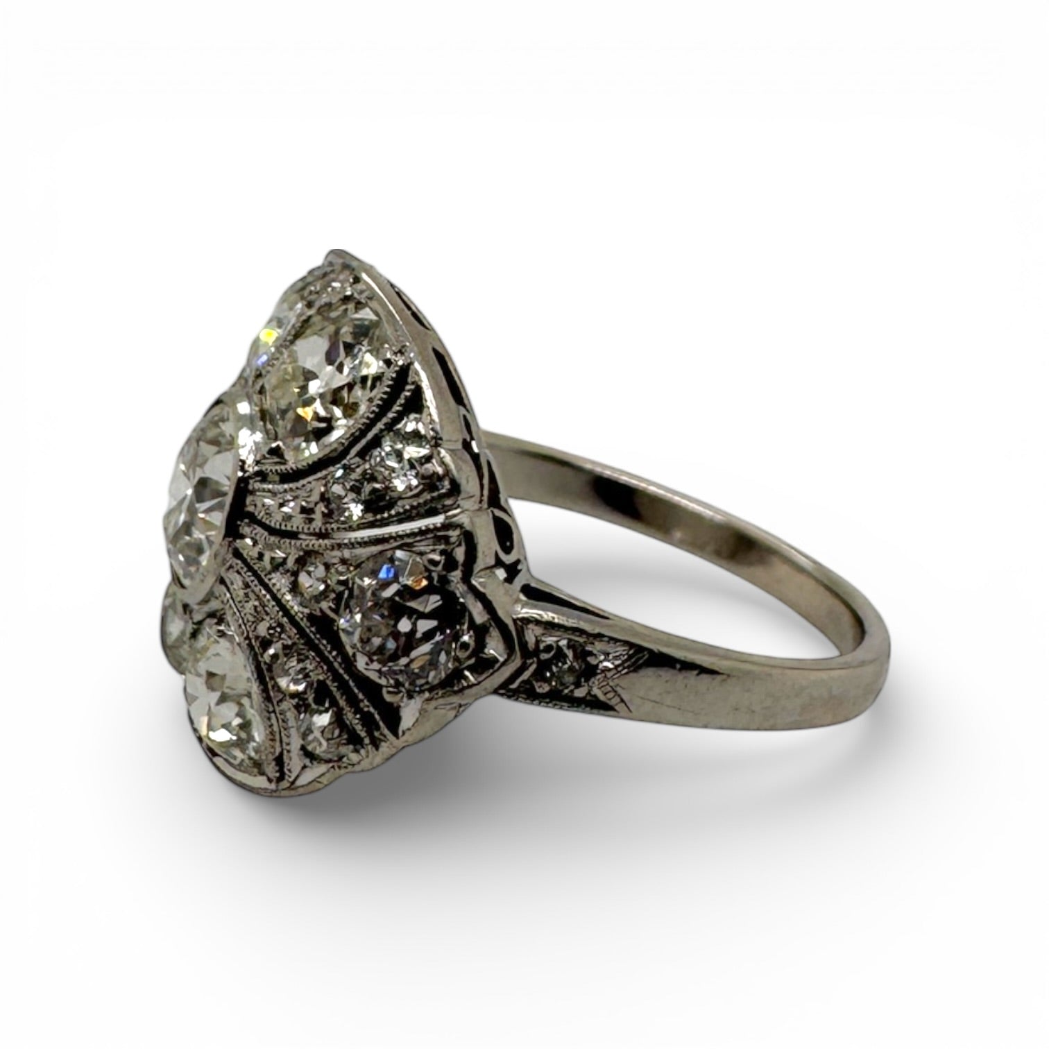 A stunning authentic Art Deco estate piece crafted in platinum, this ring showcases the refined elegance of the era. Featuring 3.20 carats of natural diamonds in a mix of old full-cut, old European-cut, old mine cut, and single cut stones, each facet captures light with vintage brilliance. Delicate milgrain detailing adorns the band, adding intricate texture and authentic period charm. Sized at 7.5, this timeless treasure combines historical significance with enduring beautyâa remarkable addition to any fine jewelry collection.