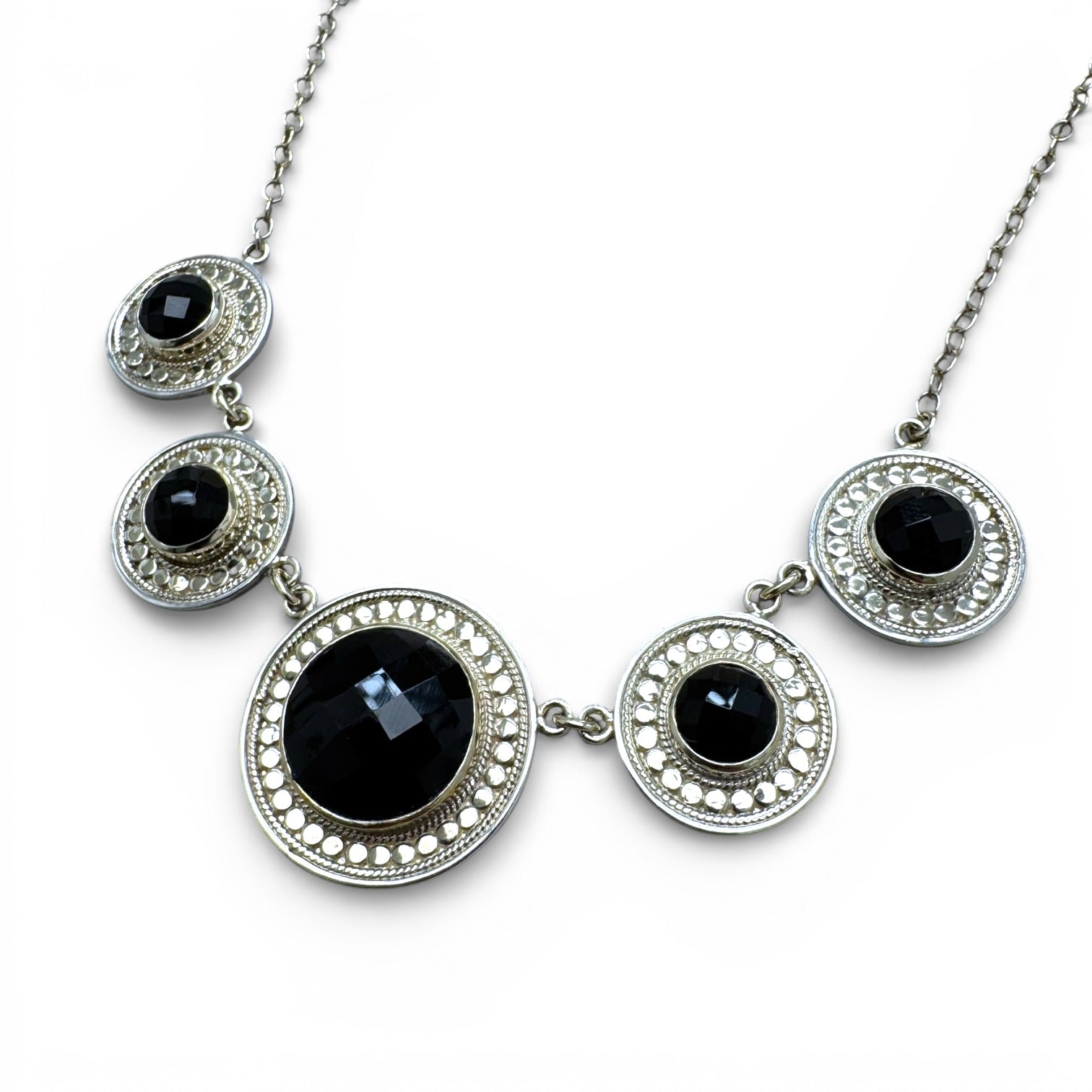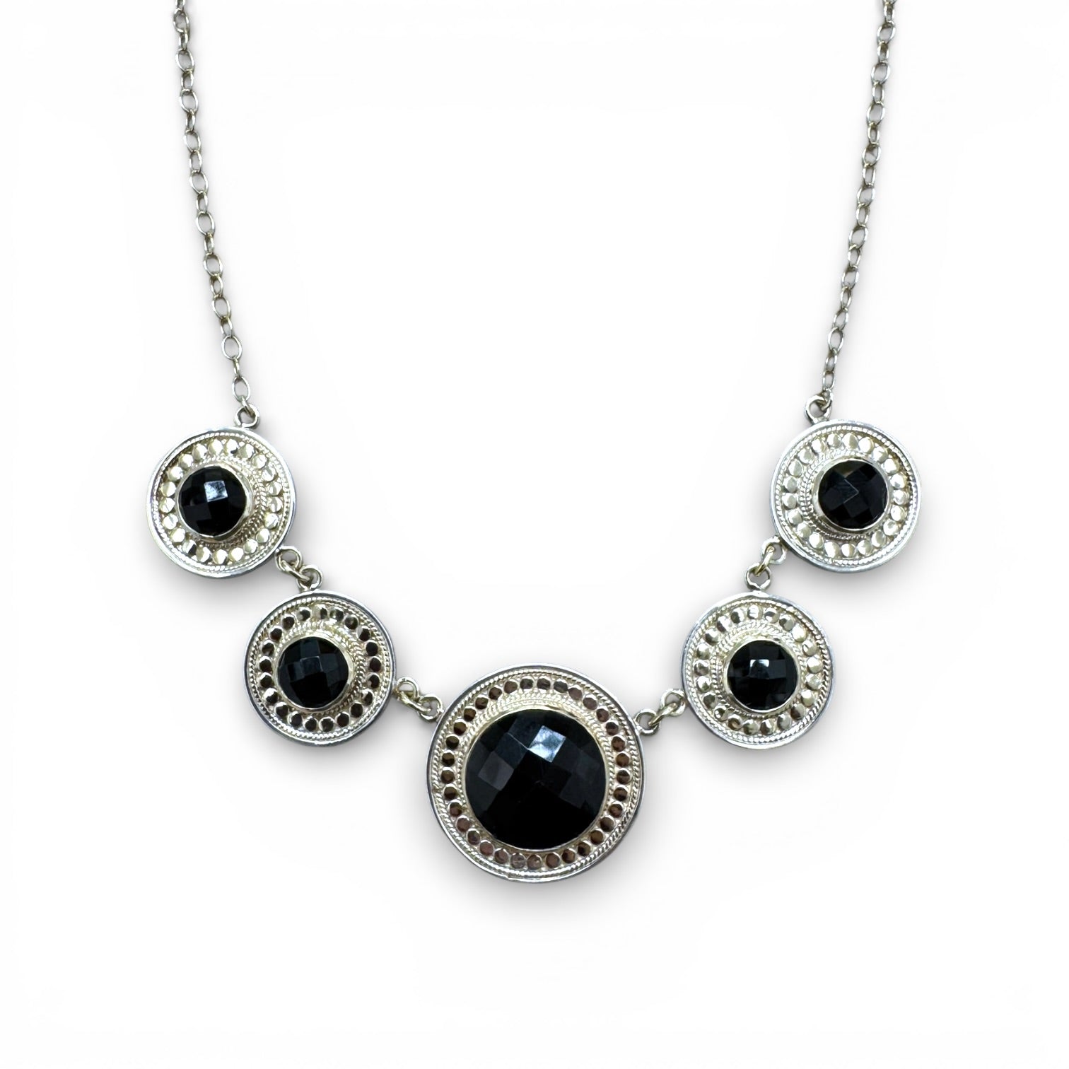 This striking Estate Silver Black Onyx Medallion Bib Necklace by designer Anna Beck showcases graduated faceted black onyx gemstones set in sterling silver bezels. Each stone is framed with beaded detailing that catches the light, creating dimensional sophistication. The adjustable cable chain spans 16.5–18.5 inches, offering versatile styling for layering or solo wear.