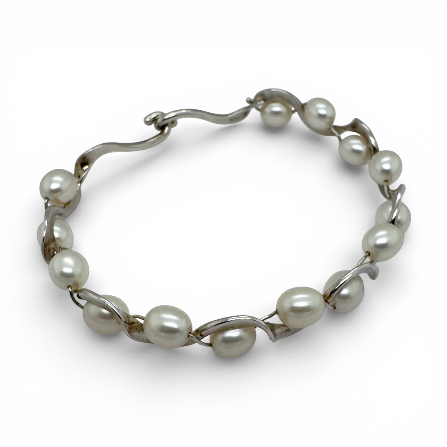 Crafted in sterling silver, this bracelet showcases Ed Levin's distinctive wavy hook design—a signature element that defines his celebrated aesthetic. Lustrous oval white freshwater pearls nestle seamlessly within polished silver waves, creating an elegant interplay of organic and sculptural forms. The intuitive hook closure ensures effortless wear, while the refined proportions suit wrist sizes 6.5" to 7".