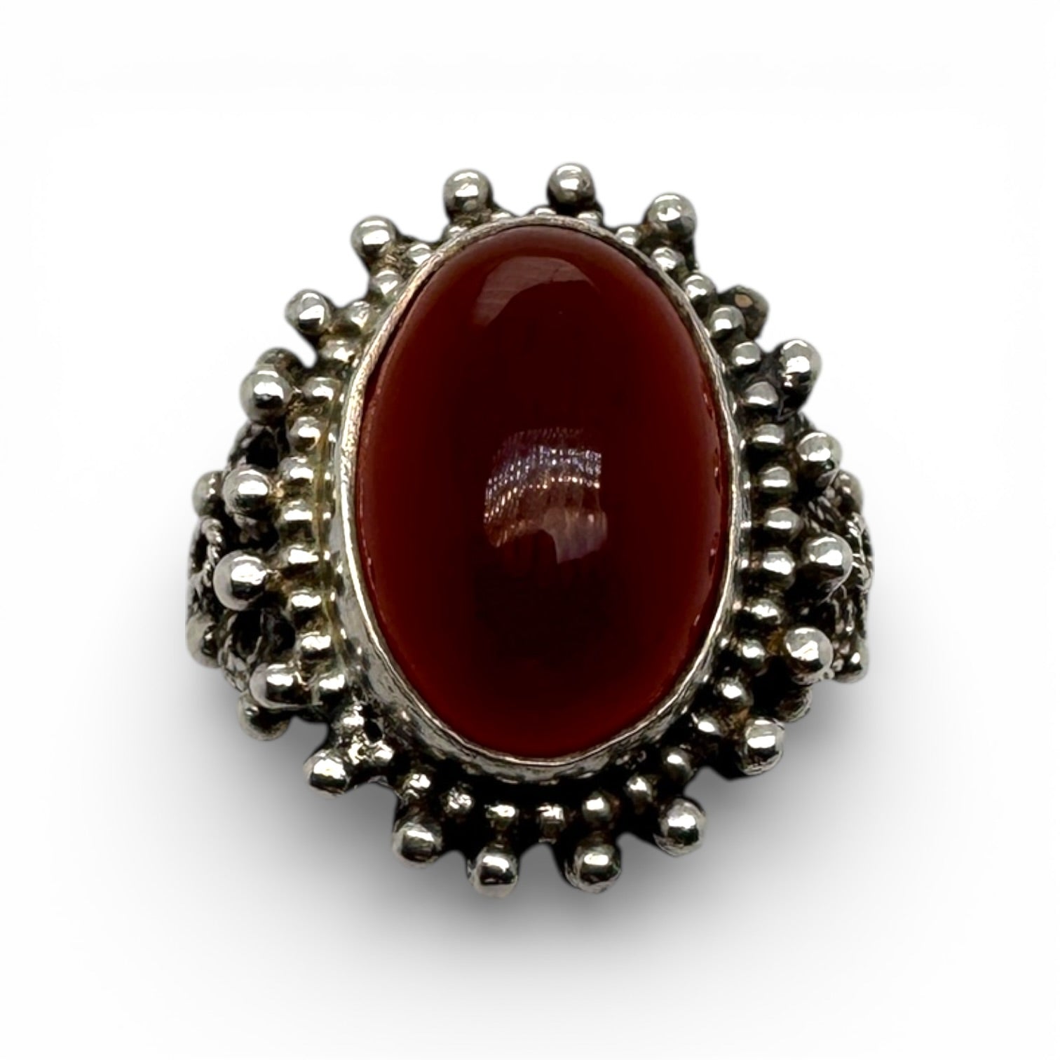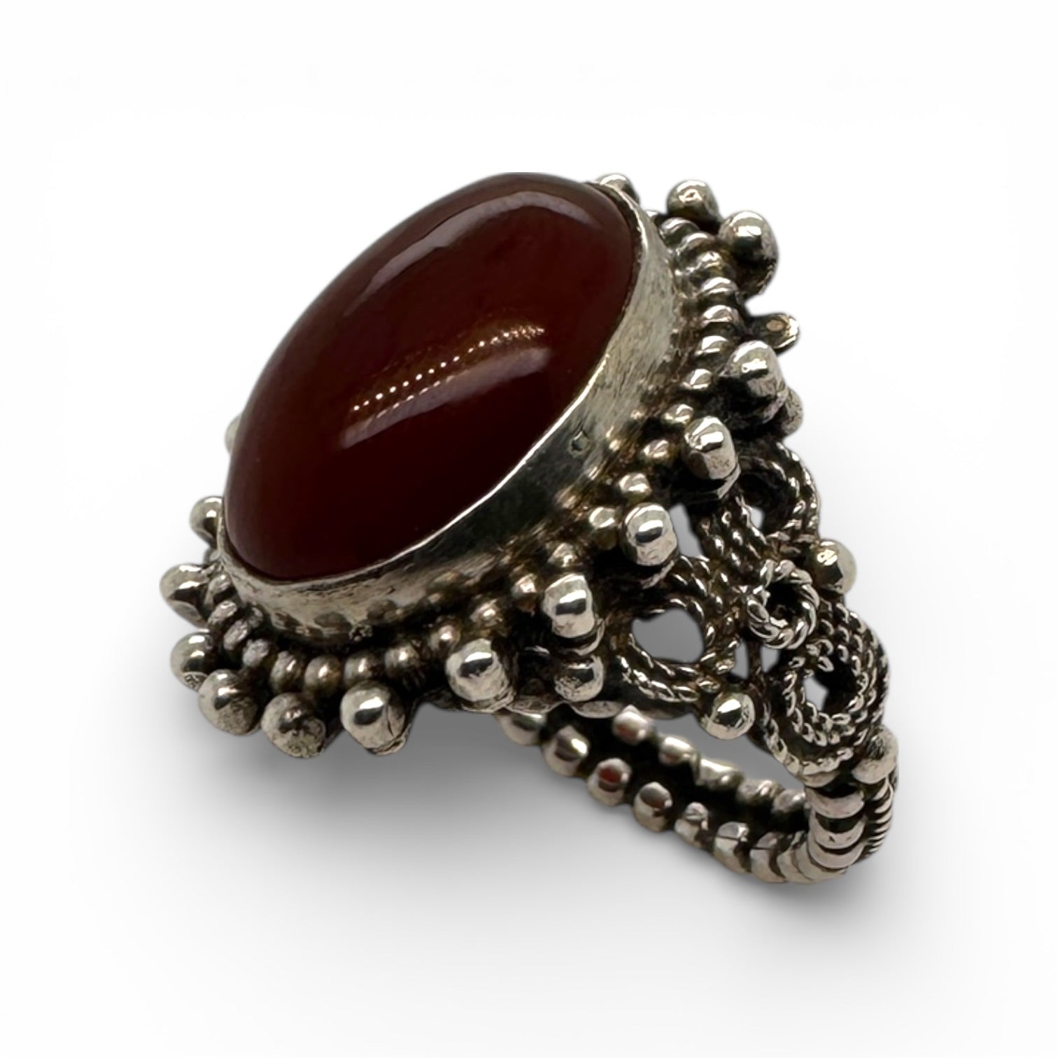 This striking estate ring showcases a warm, orangey-red sard cabochon—a variety of chalcedony prized for its rich, earthy hue—set in sterling silver. Intricate granulation work and twisted, ropey textures throughout the band create authentic bohemian character and vintage appeal.