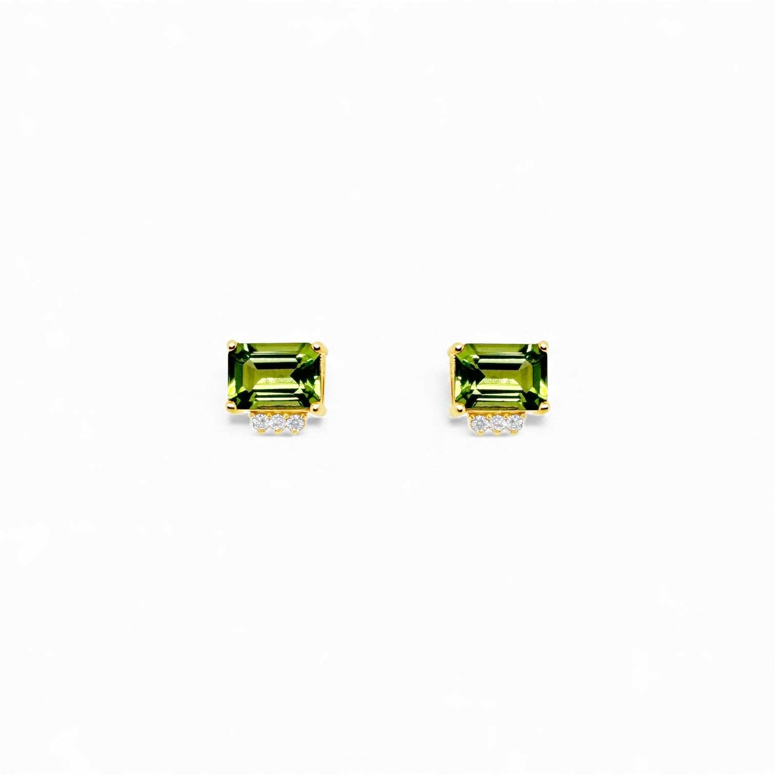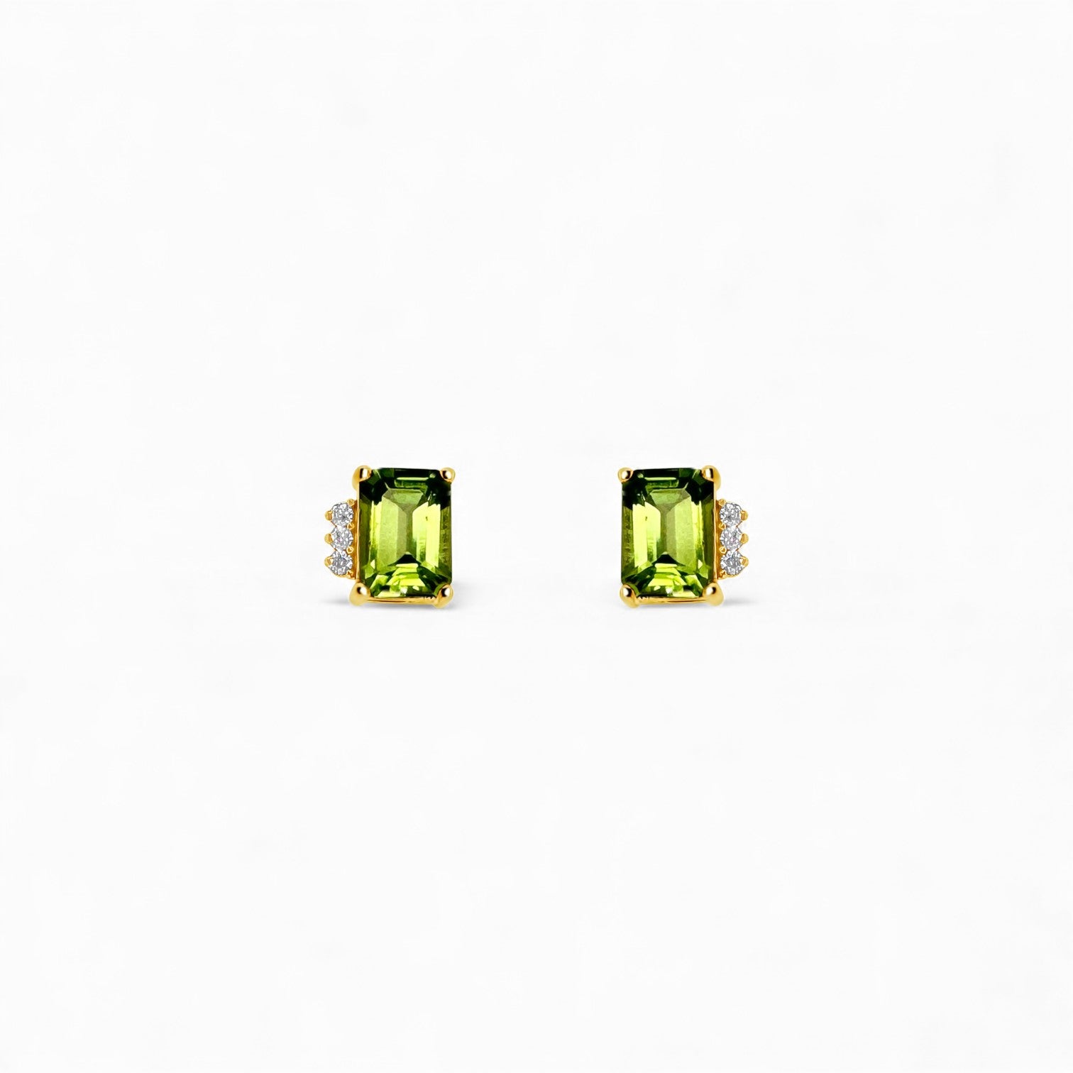Elevate your everyday look with these stunning 14K yellow gold stud earrings, featuring vibrant spring green emerald-cut peridots accented by a trio of sparkling natural diamonds. The versatile design allows you to wear them in multiple orientations, giving you flexibility to match your mood and style. Perfect for adding a pop of color to any outfit while maintaining the timeless elegance of fine jewelry.