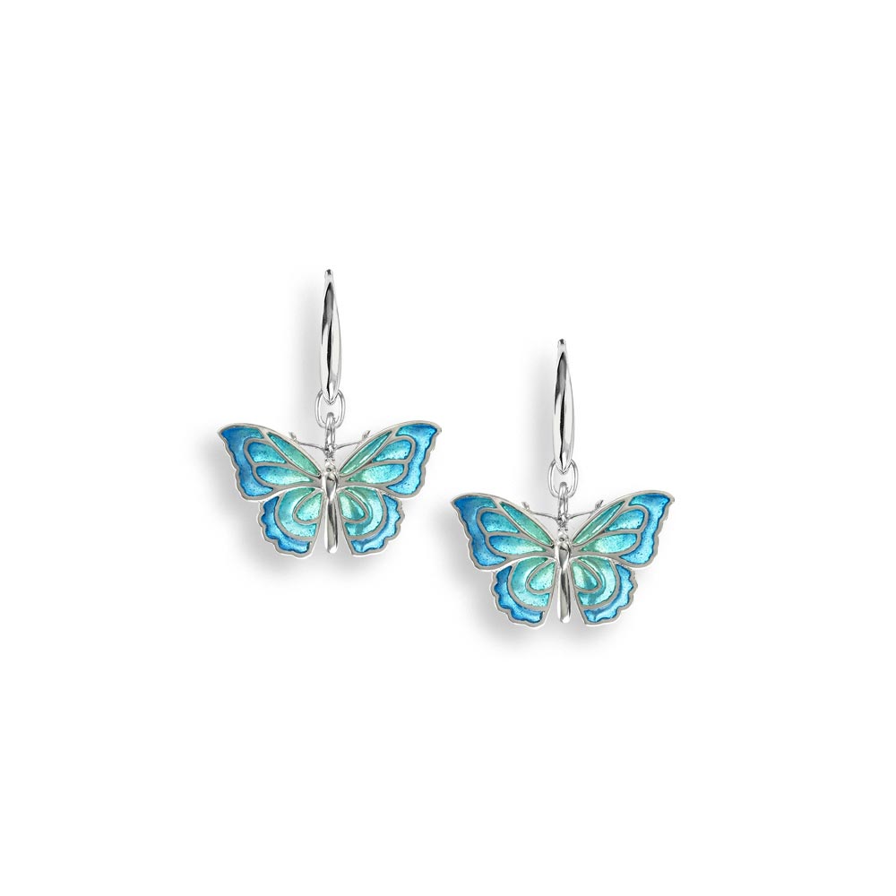 These Blue Plique-a-Jour Butterfly Wire Earrings feature sterling silver with delicate see-through blue and turquoise enamel, creating a light and airy look. Rhodium plating ensures they stay bright and resist tarnish, making care simple. The comfortable wire tops provide a secure fit for all-day wear, combining elegance with ease. Perfect for adding a touch of color and charm to your everyday style.