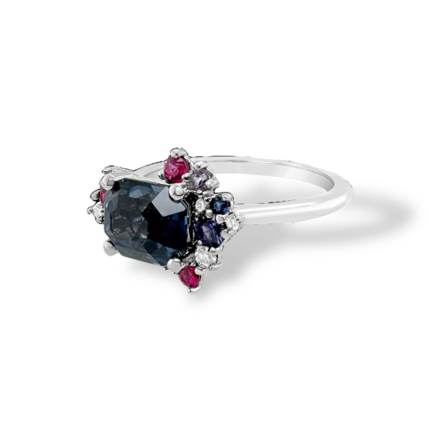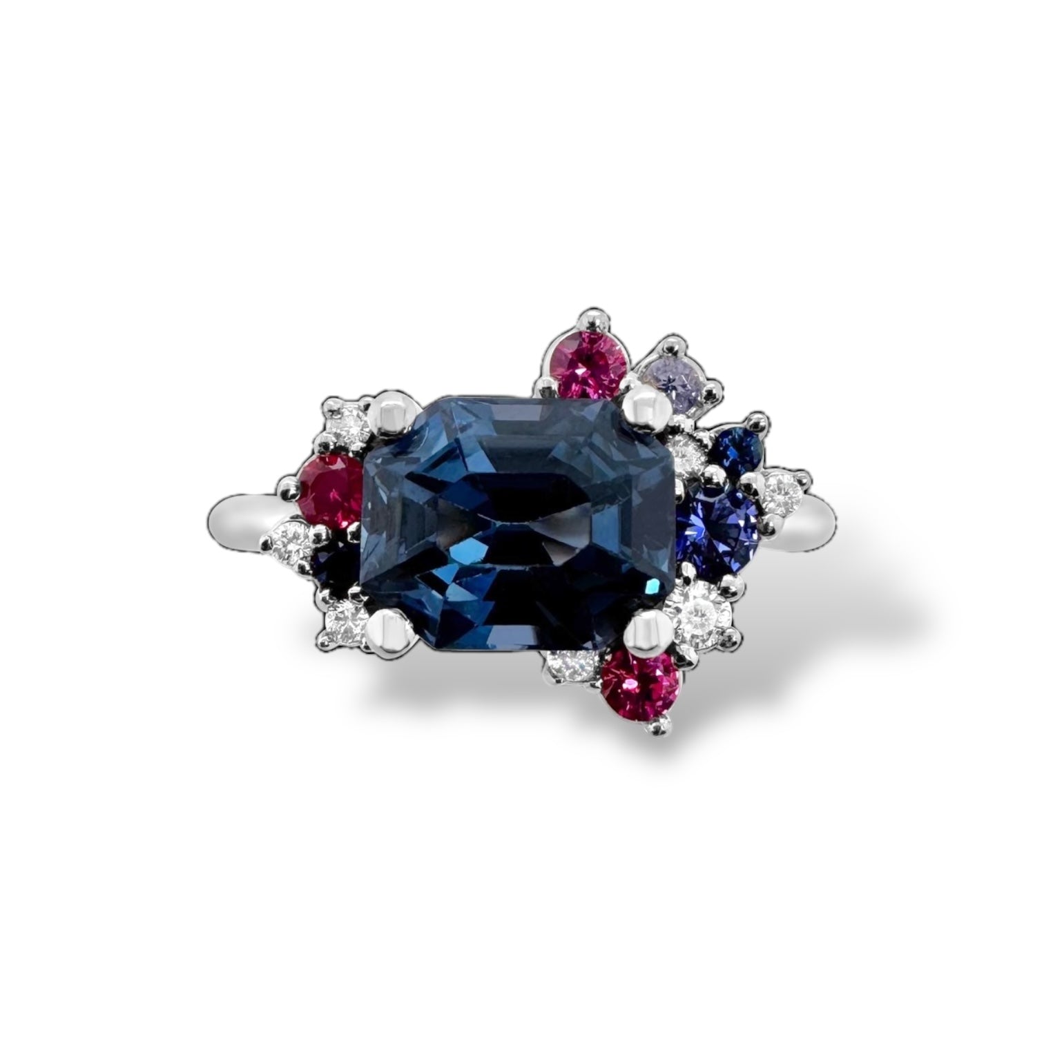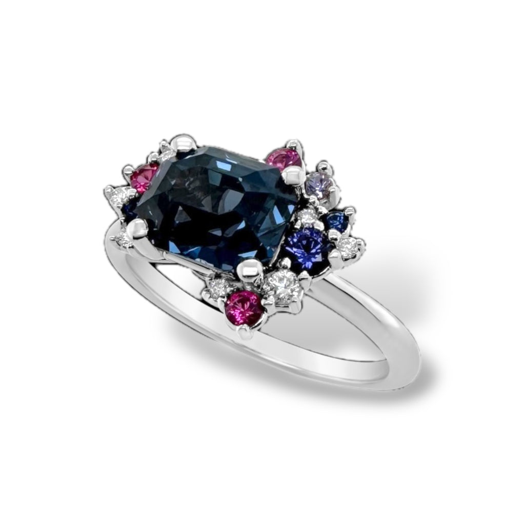 Handcrafted in 14k white gold, this custom designed ring features a stunning smoky Blue Spinel at its center. Surrounding the Spinel is a mix of pink and blue sapphires, delicate lavender tanzanite, and sparkling diamonds. The asymmetrical, whimsical design adds a touch of playfulness to this one-of-a-kind ring.