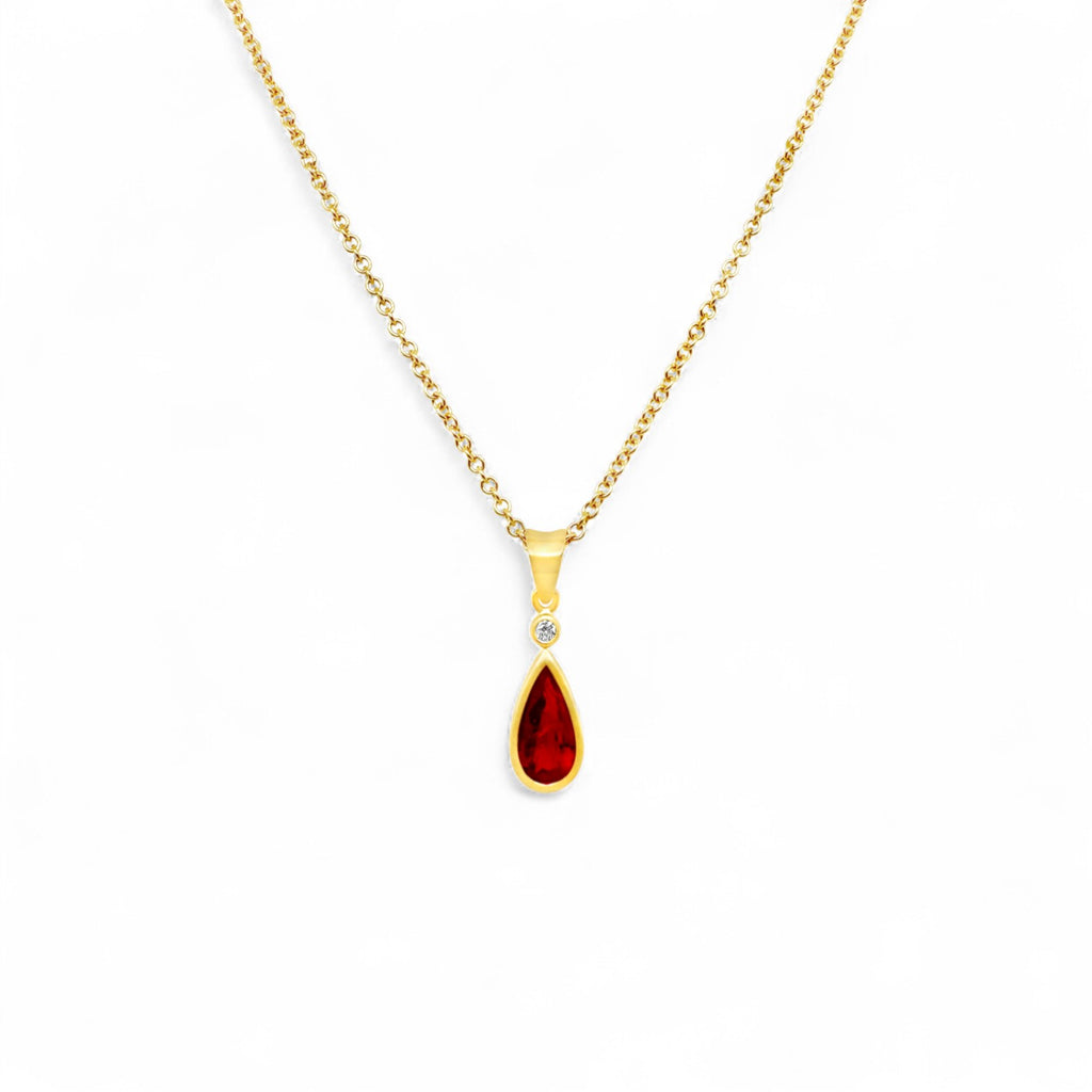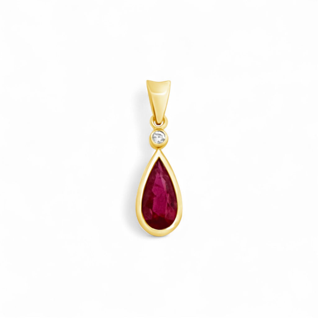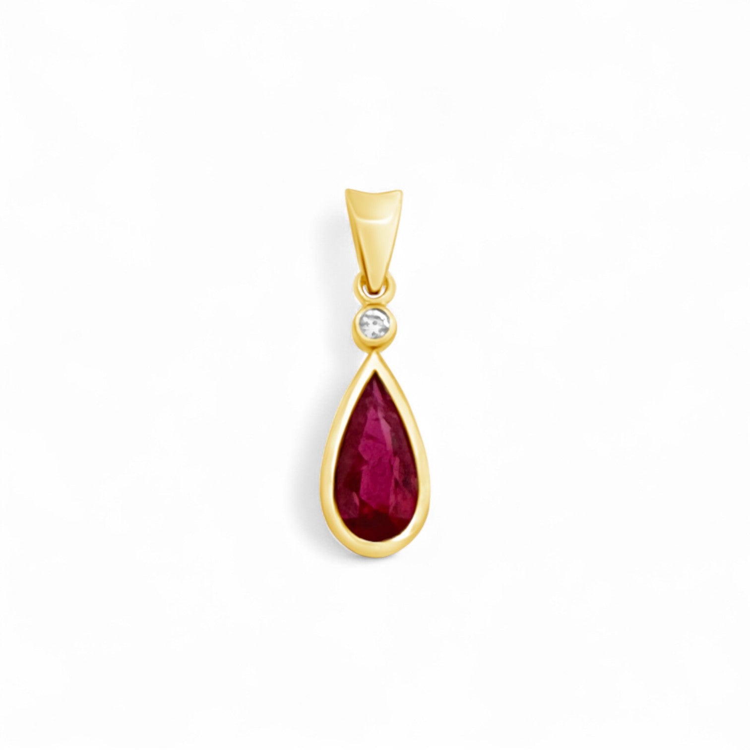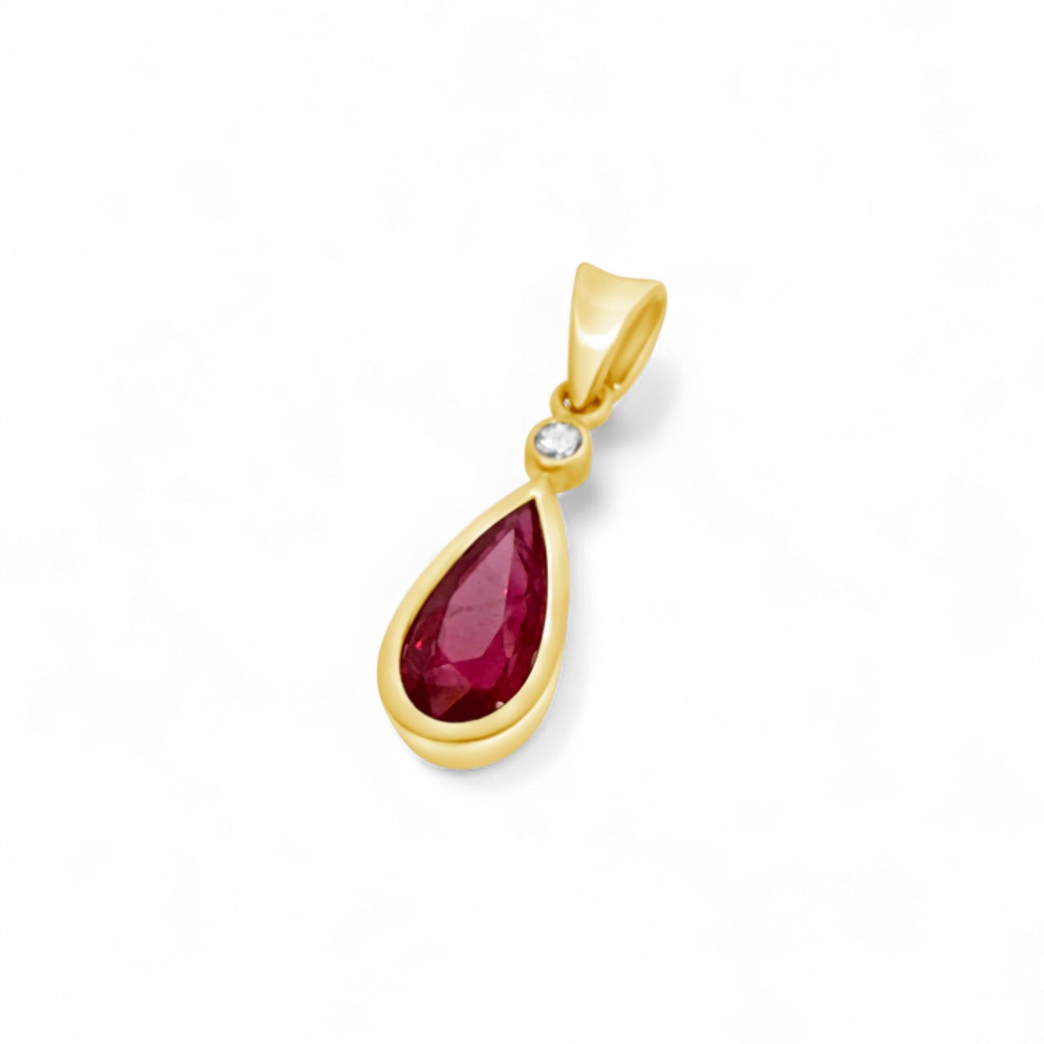 This elegant pendant features a stunning 1.00 carat pear-shaped Ruby secured in a soft satin brushed 14k yellow gold bezel. The luxurious design is enhanced with a bezel-set diamond accent that catches the light beautifully. The brushed finish adds a contemporary touch to this timeless piece, perfect for both everyday wear and special occasions. Chain sold separately.