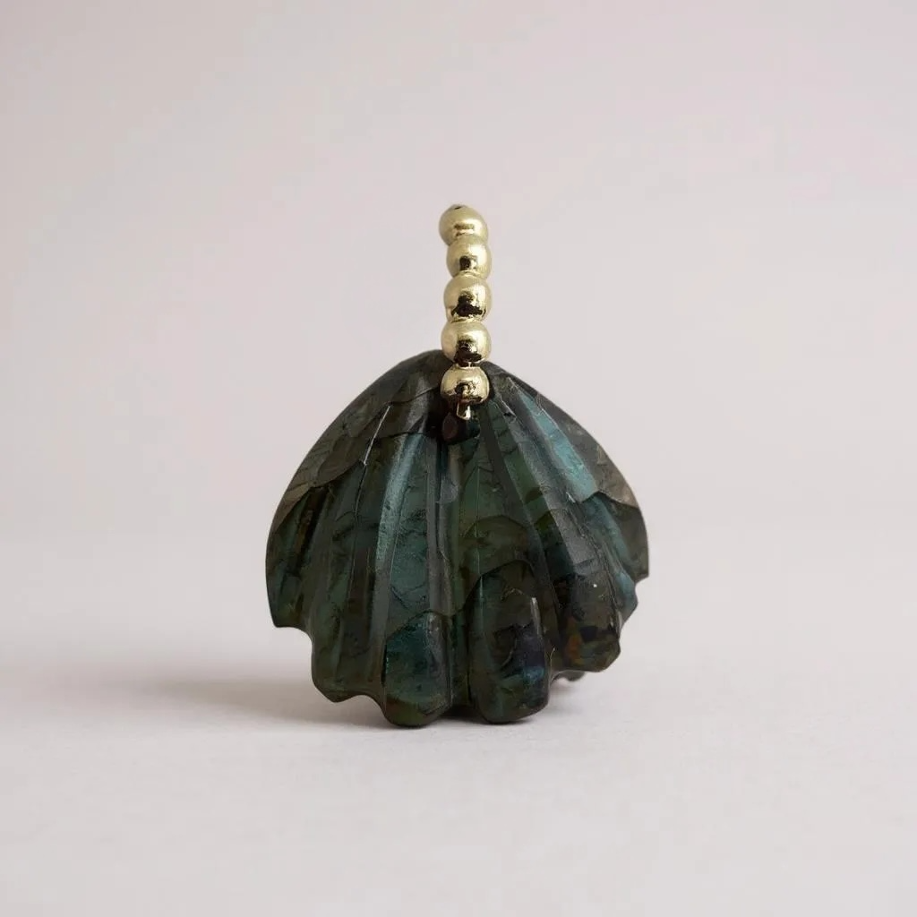 This handcrafted pendant from our Carved Capsule Collection features a beautifully carved iridescent labradorite shaped like a scallop shell, complimented by a 14k yellow gold beaded bail. Its unique design captures the essence of the sea, making it perfect for those who love nautical style. Wear it on a chain, cord, or cable to add a subtle, elegant nautical touch to any outfit.