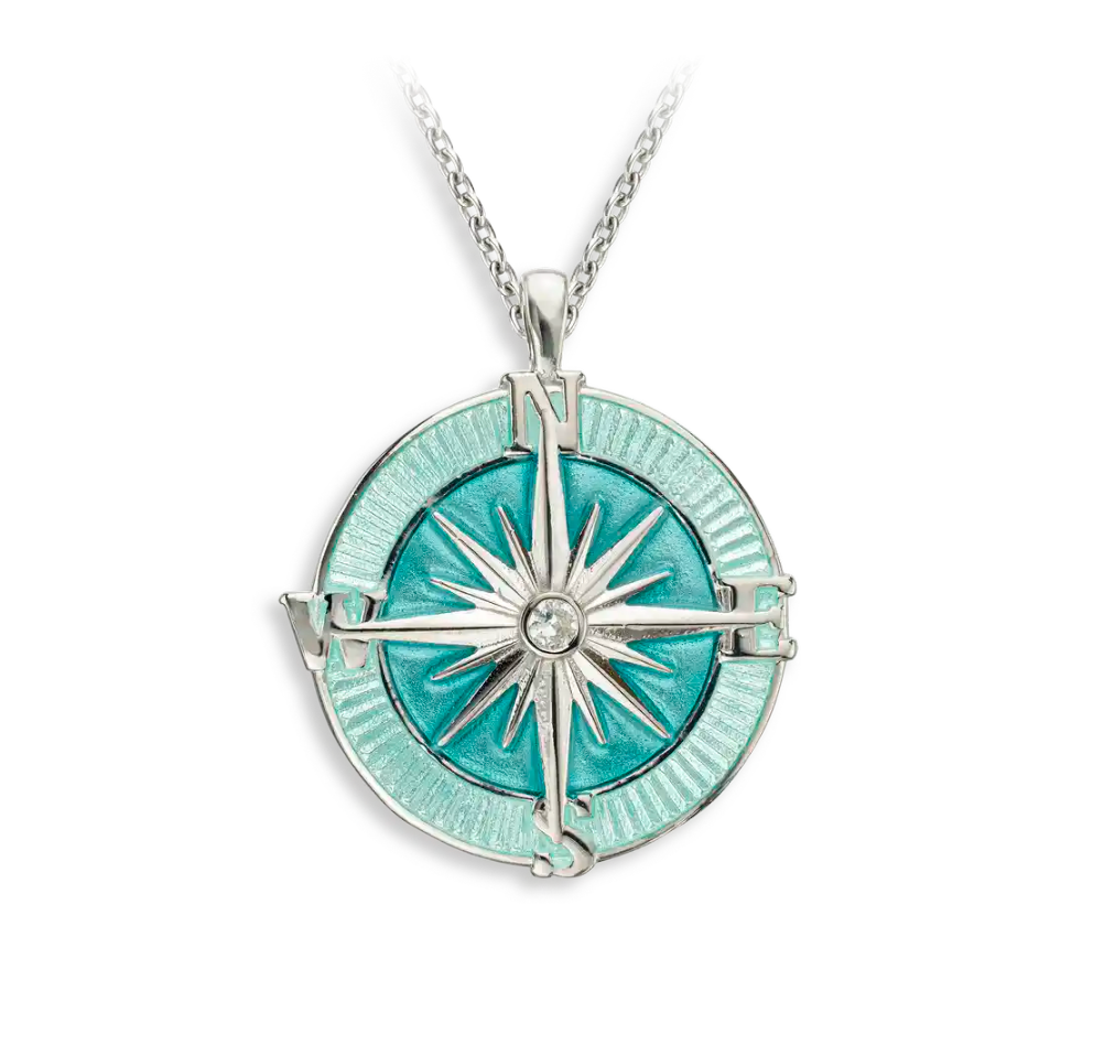 Crafted from sterling silver, the Large Sea Green Enamel Compass Necklace features a double-sided enamel design that adds versatile elegance. Its adjustable 20-inch rolo chain ensures a perfect fit, while the rhodium plating provides durability and easy maintenance. This necklace is a thoughtful accessory that combines style with lasting quality, supporting your everyday look with a meaningful touch.