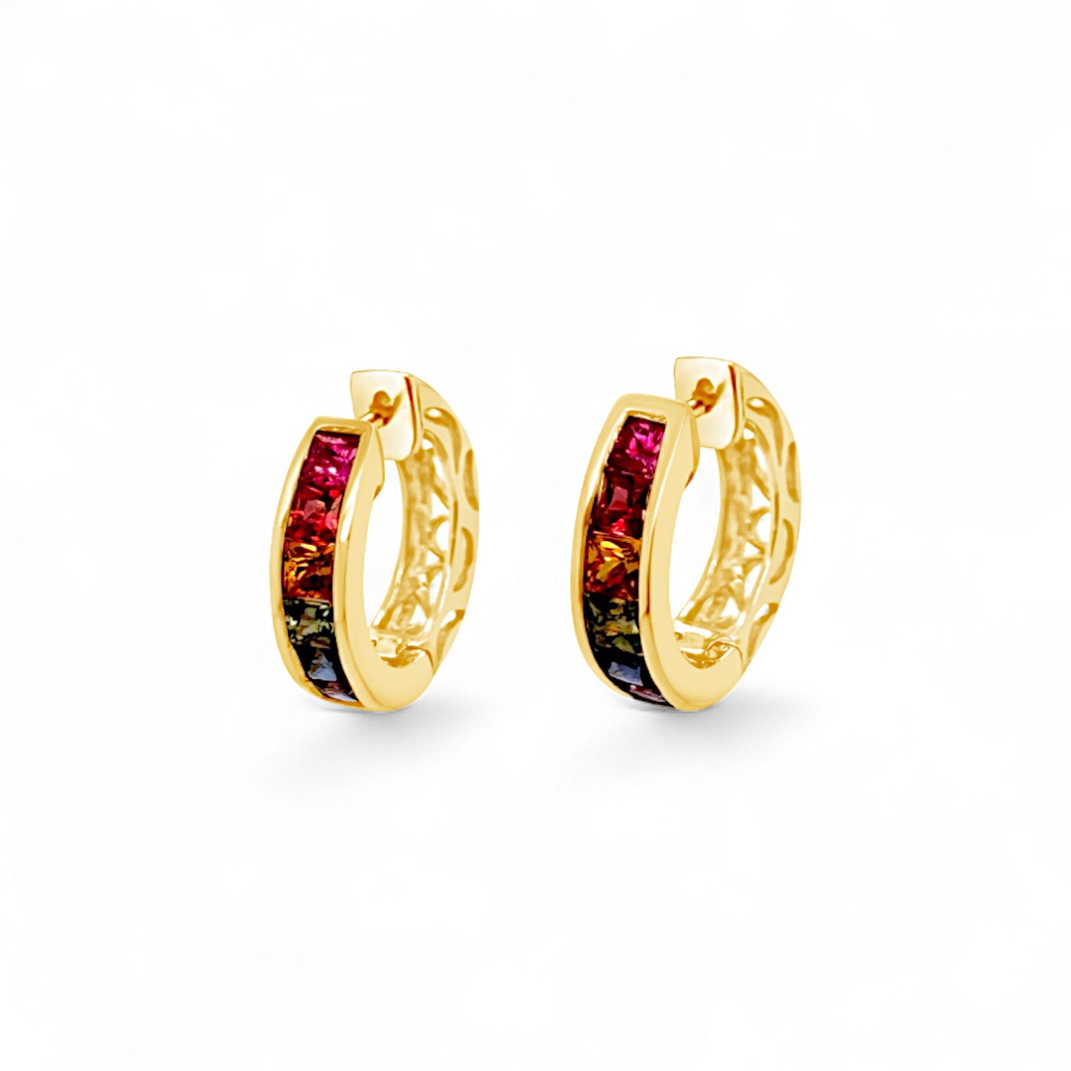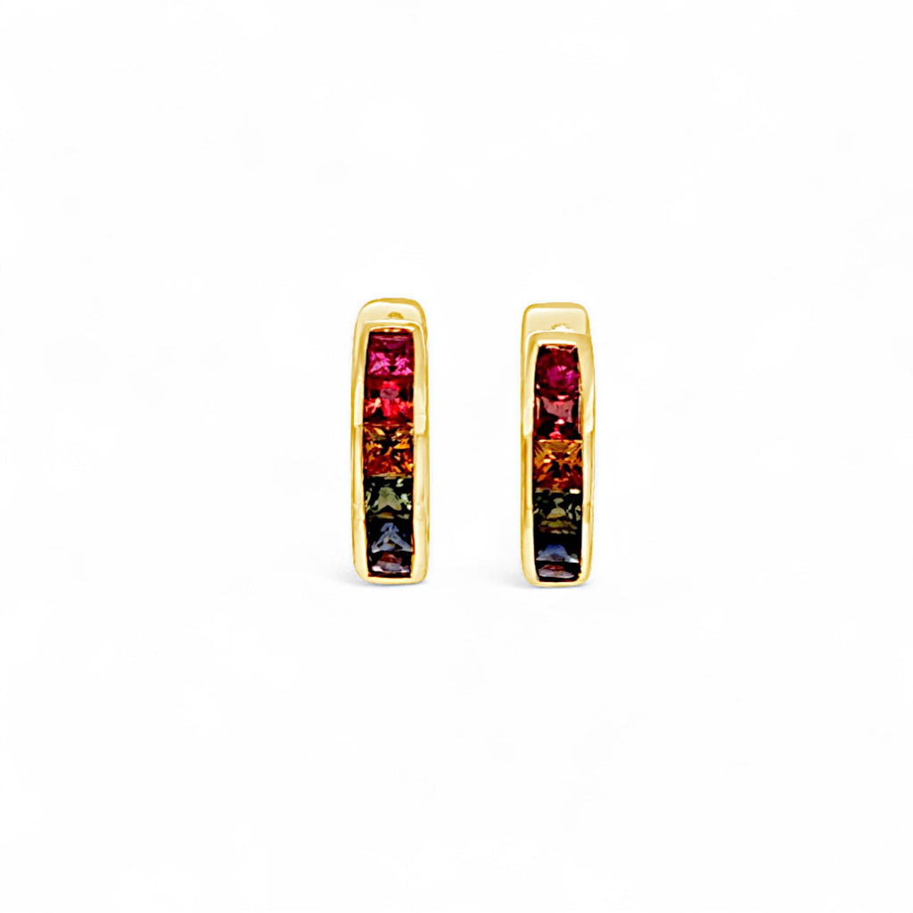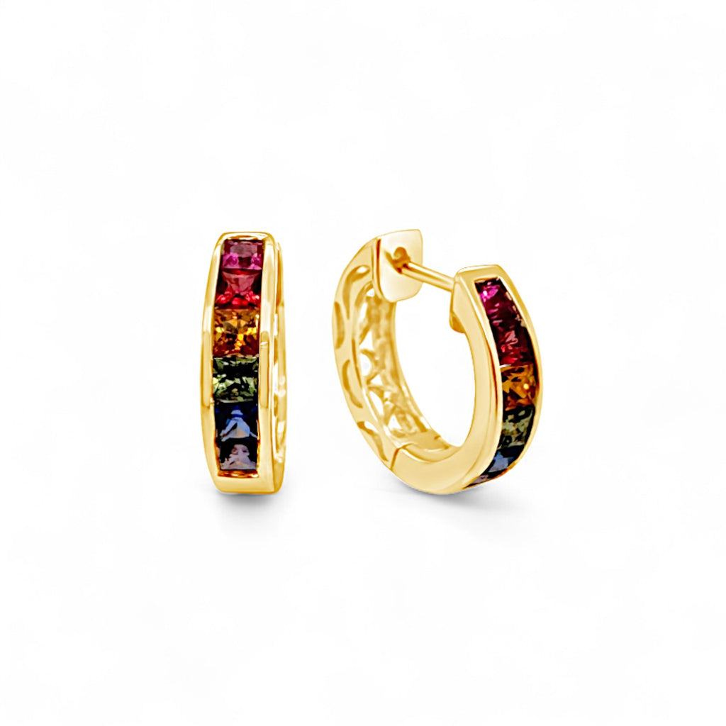 Embrace the spectrum of color with these exquisite Rainbow Sapphire Hoop Earrings. Crafted in luxurious 14k yellow gold, these hoops feature channel-set princess-cut sapphires arranged in a stunning red, orange, yellow, green, blue, and purple rainbow ombré. The convenient click-in endless design ensures secure wearing, while delicate pierced scroll detailing adds an elegant touch. With 1.21 CTW of vibrant sapphires, these hoops bring a colorful statement to any outfit.