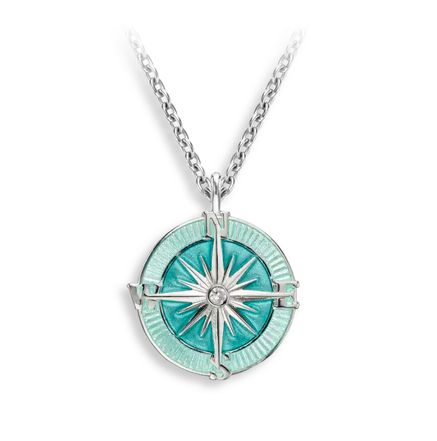 This Small Sea Green Enamel Compass Necklace features a double-sided enamel design set in sterling silver, offering both style and durability. The adjustable 20-inch rolo chain ensures a comfortable fit, while the rhodium plating makes it easy to care for and maintain its shine. Perfect for everyday wear, this necklace combines meaningful design with lasting quality.
